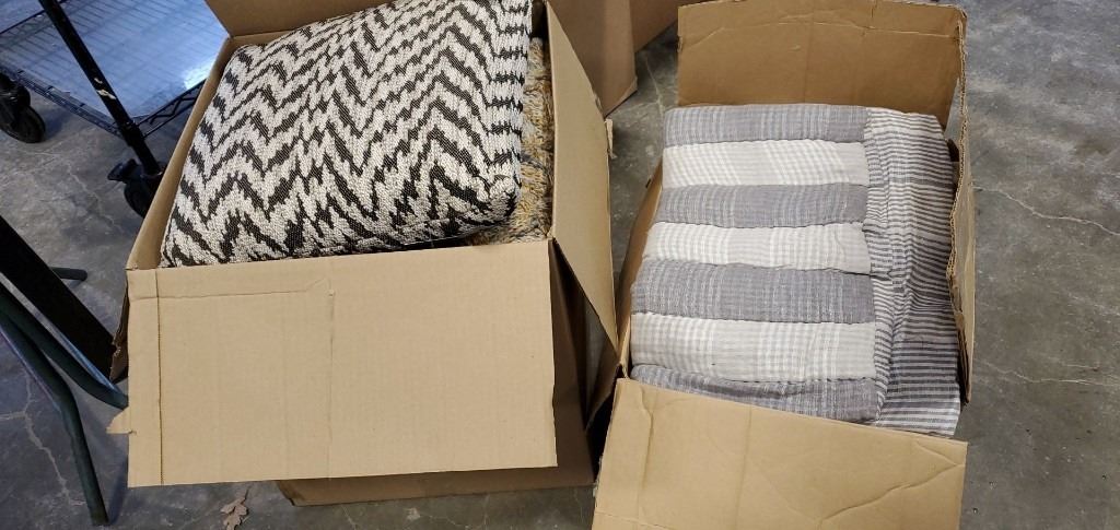 2 BOXES OF THROW PILLOWS, BLANKETS
