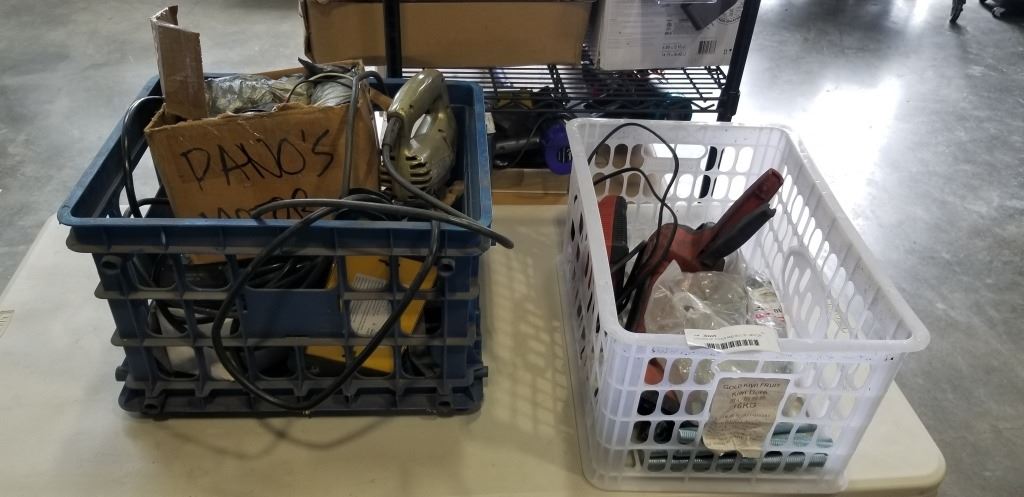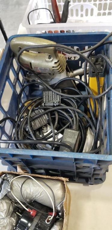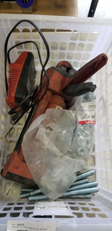 2 BOXES OF TOOLS AND BOLTS - MOTOR, POWER CORDS, JIGSAW, ETC