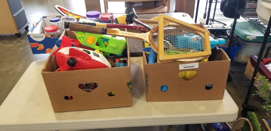 2 BOXES OF TOYS AND 2 VINTAGE RACKETS