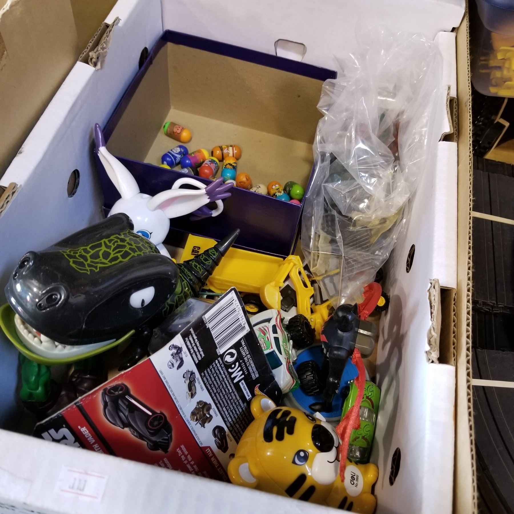 2 BOXES OF TOYS INCLUDING STAR WARS HOT WHEEL, MIGHTY BEANZ, AND SLOT CAR TRACK