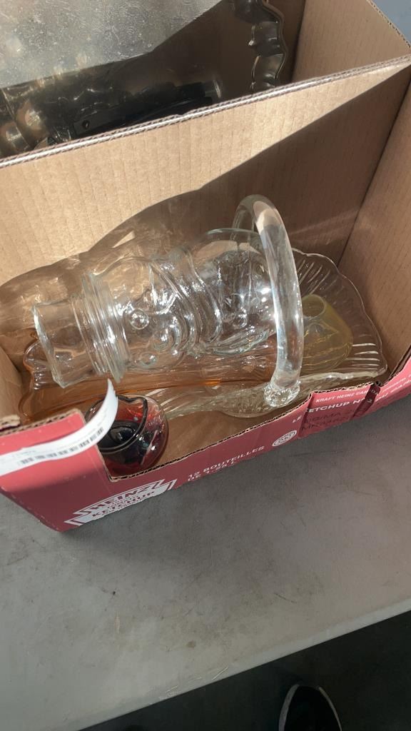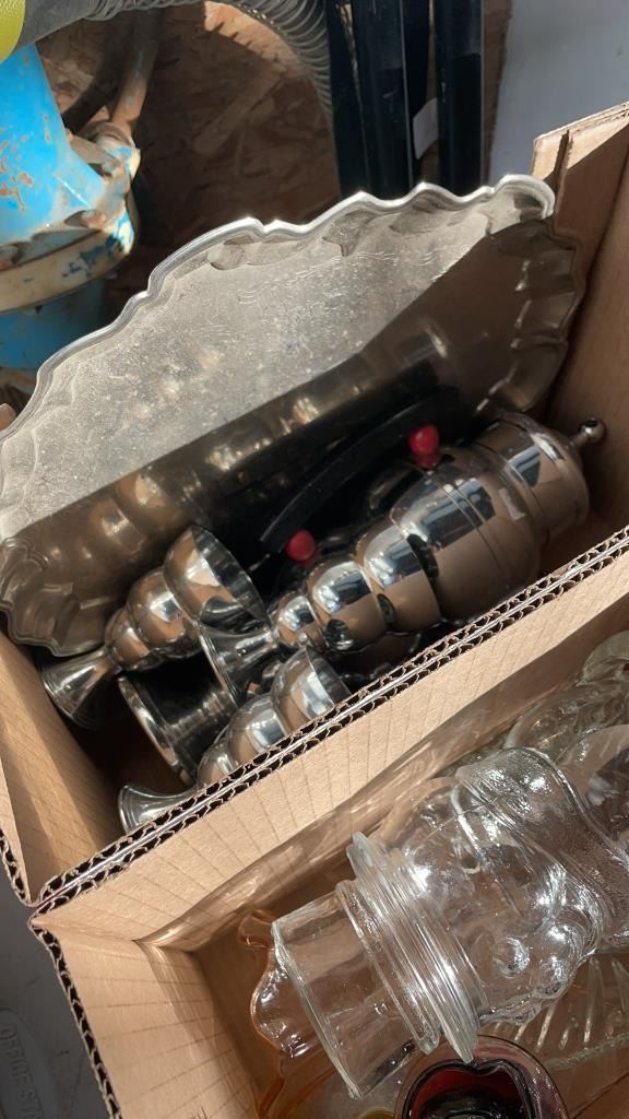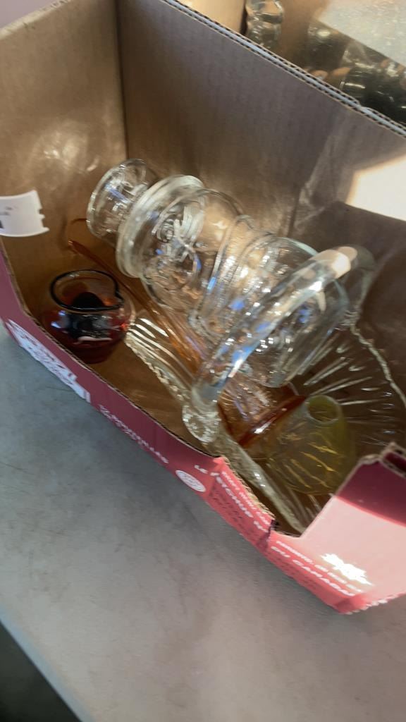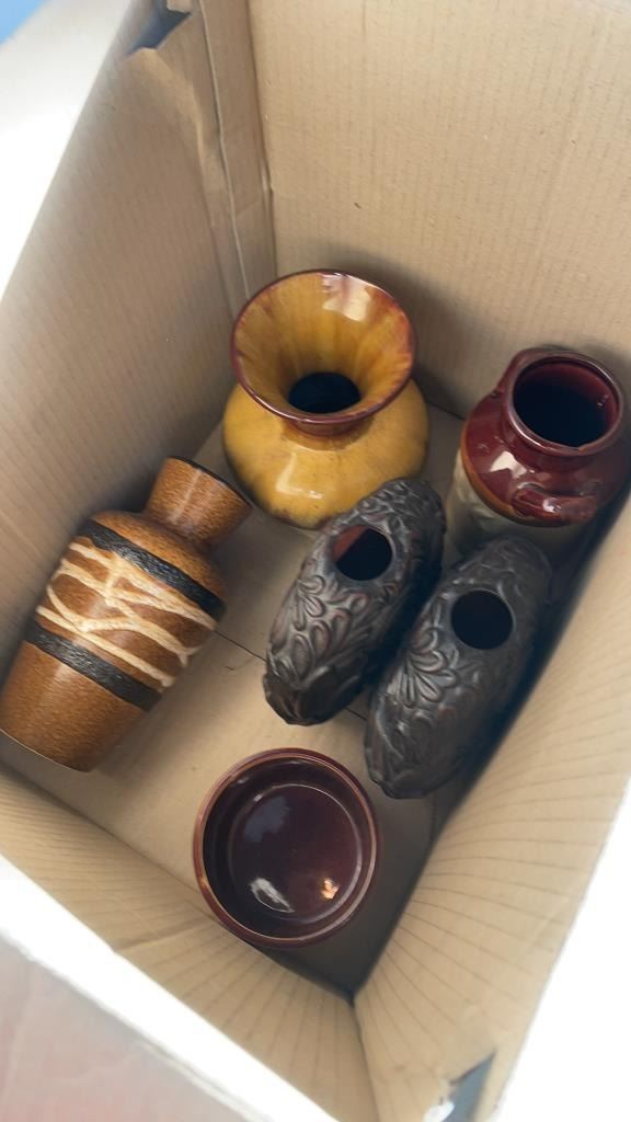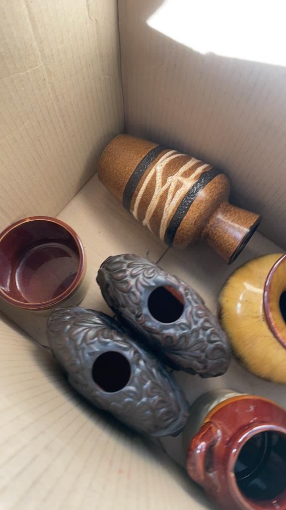 2 BOXES OF VASES, DECORATIONS, BLUE MOUNTAIN POTTERY AND OTHER