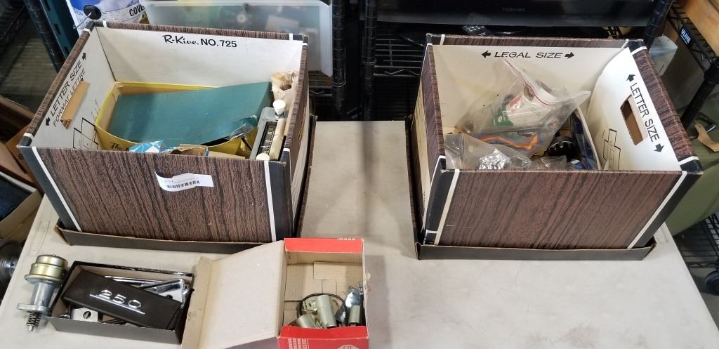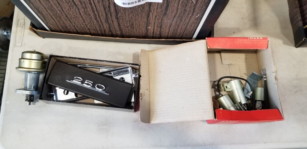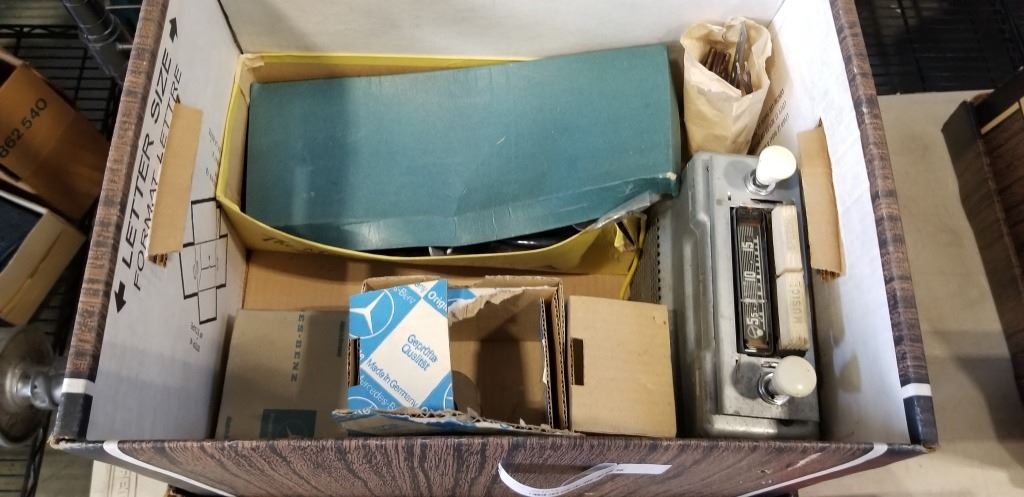 2 BOXES OF VINTAGE MERCEDES CAR PARTS, RADIO UNIT ETC
