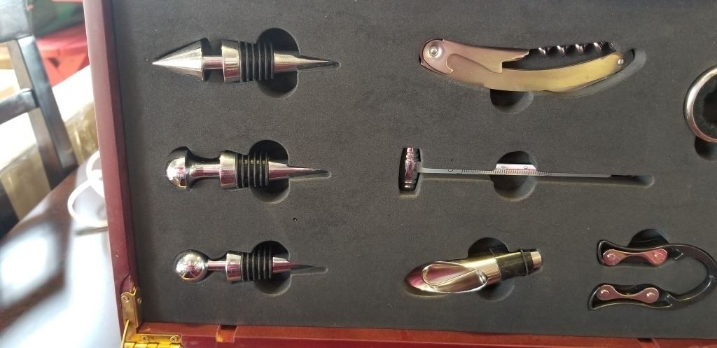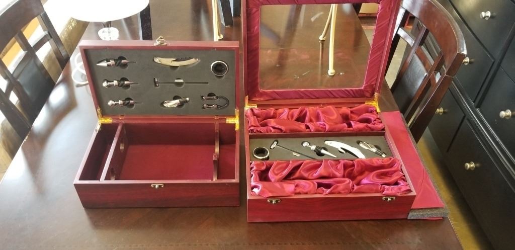 2 BRAND NEW WINE GIFT BOXES - 2 BOTTLE WINE HOLDER W/ CORKSCREW, POURER, THERMOMETER, AND DRIP RING AND 2 BOTTLE WINE HOLDER W/ CORKSCREW, BOTTLE STOPPER, POURER, AND FOIL CUTTER