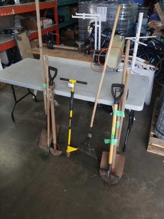 2 BUNDLES OF GARDEN TOOLS, RAKES, SHOVELS