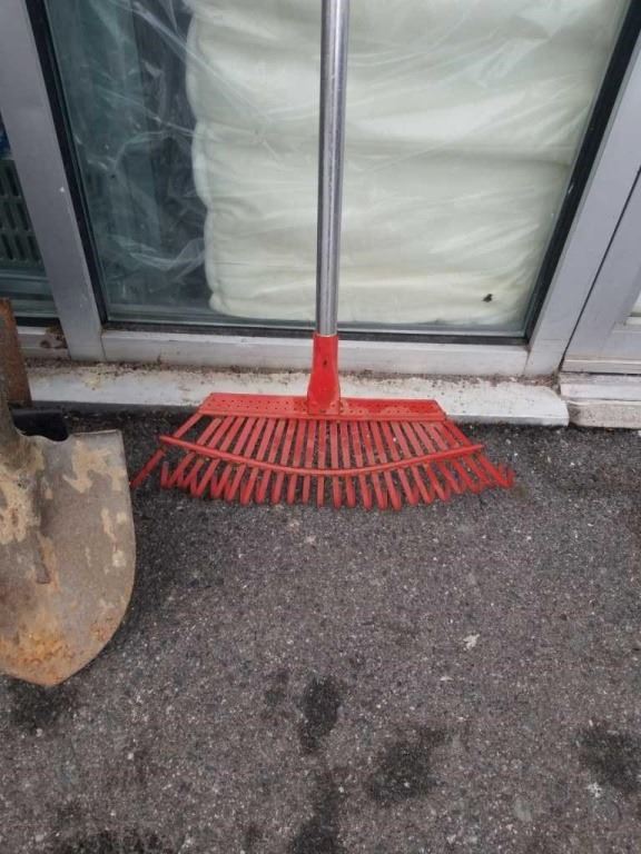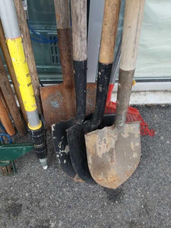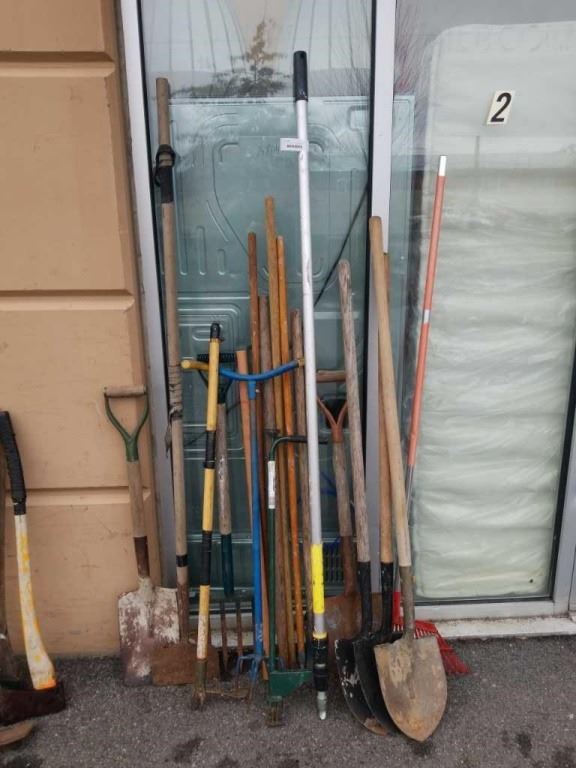 2 BUNDLES OF GARDEN TOOLS, SHOVELS, RAKE, PITCHFORK, EXTENTION POLE