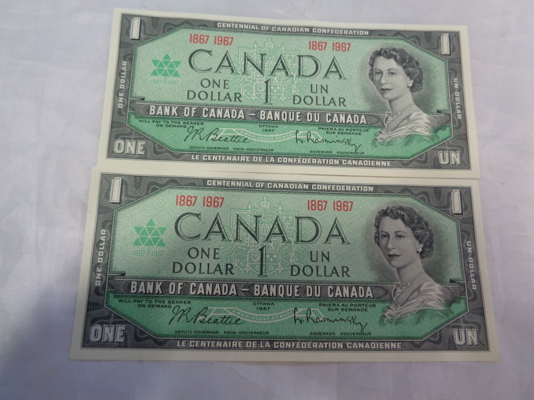 2 CANADIAN 1 DOLLAR BILLS, 2 SILVER DIMES, AND SILVER BAR