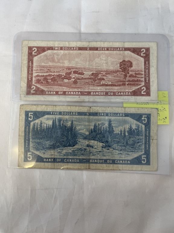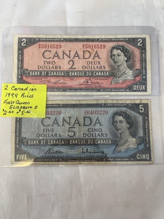 2 CANADIAN 1954 BILLS THE FIRST QUEEN ELIZABETH II $2 AND $5