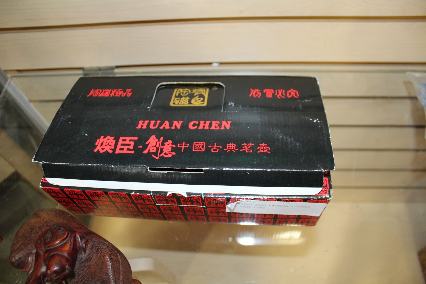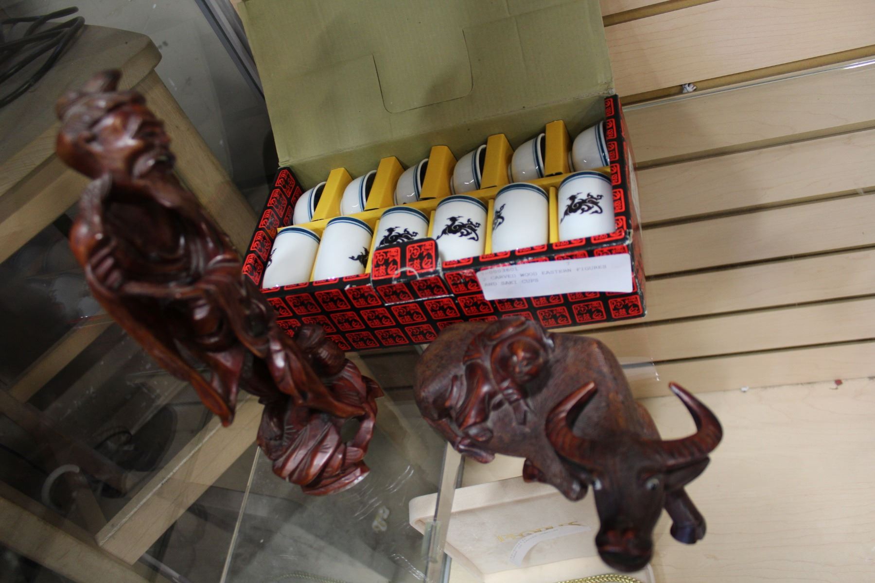 2 CARVED WOOD EASTERN FIGURES AND SAKI CUPS