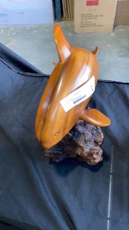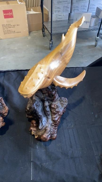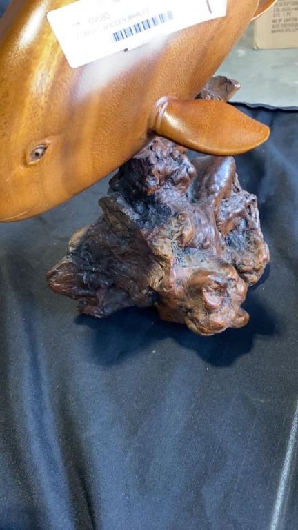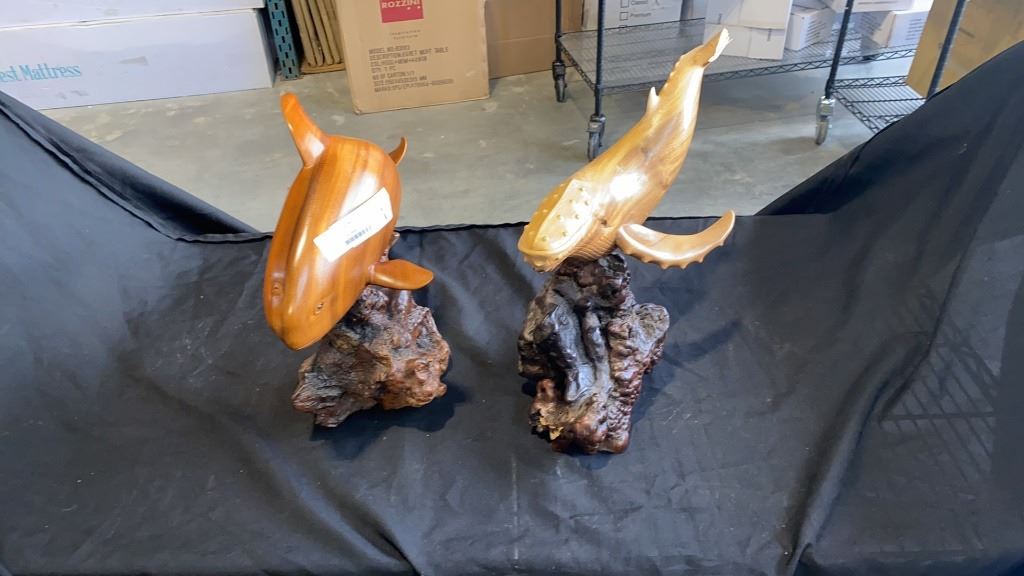 2 CARVED WOODEN WHALES ONE HAS TAIL DAMAGE