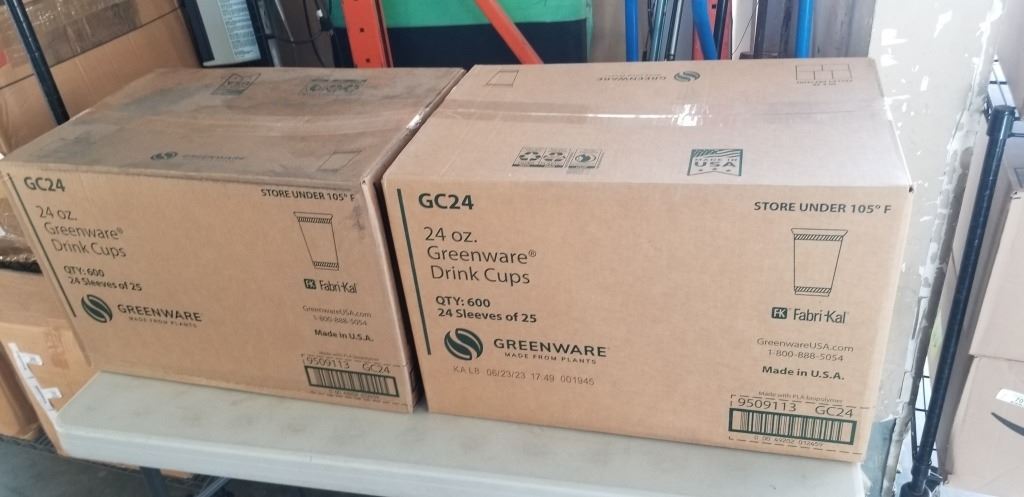 2 CASES OF 600 GREENWARE DRINK CUPS, 24 SEEVES OF 25 PER BOX