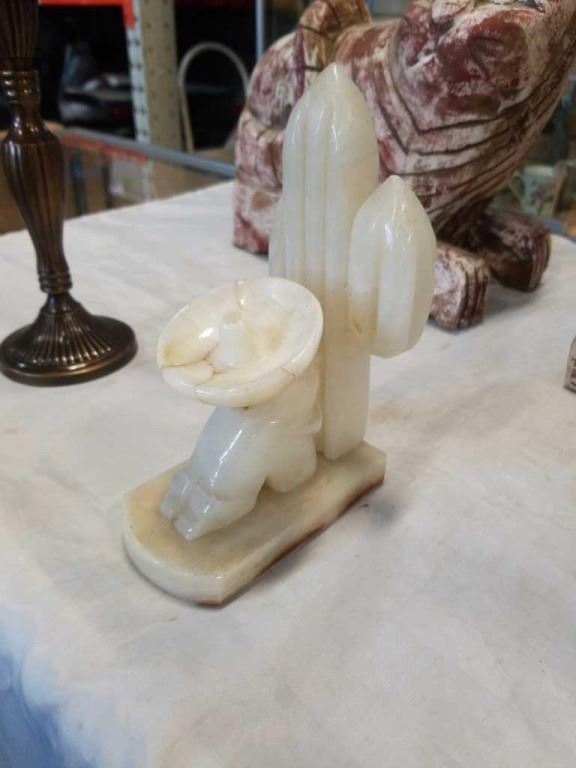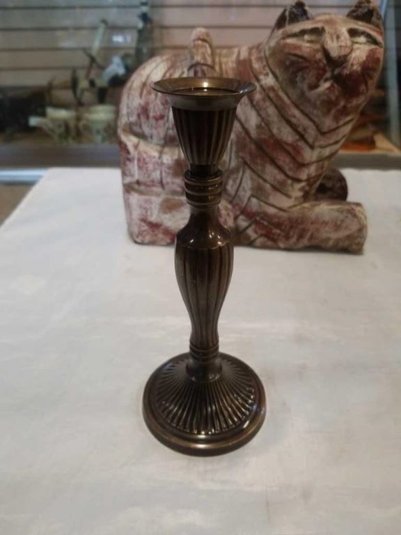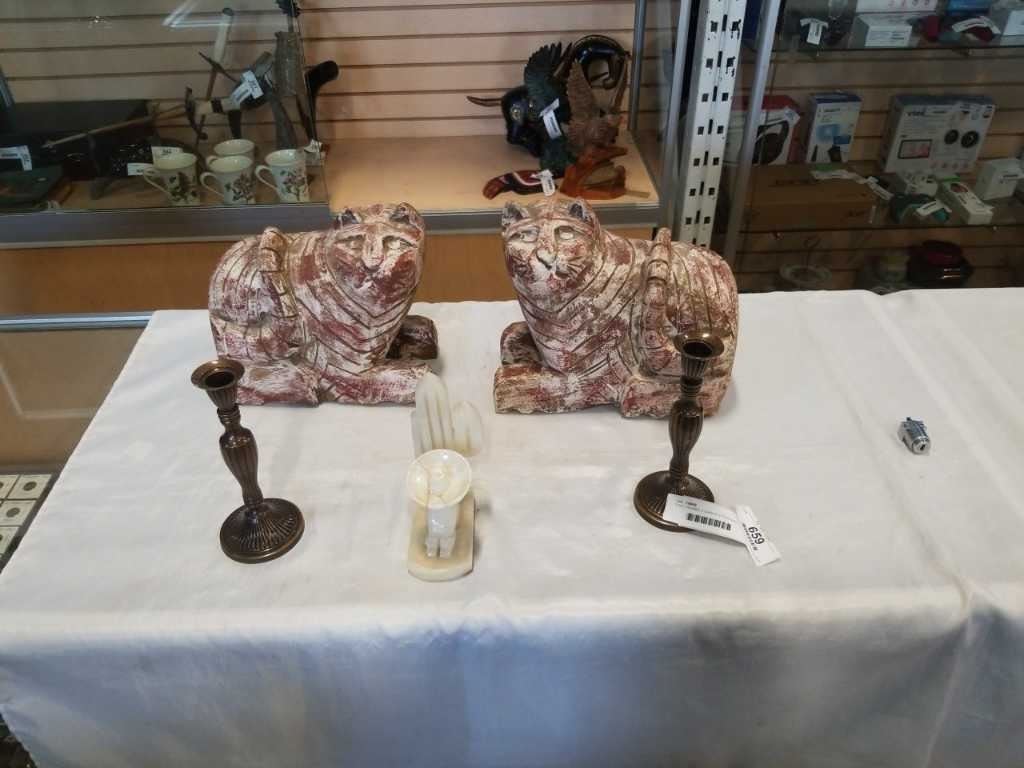 2 CAT FIGURES, 2 CANDLE STICKS AND STONE FIGURE