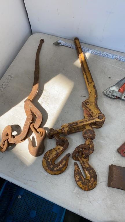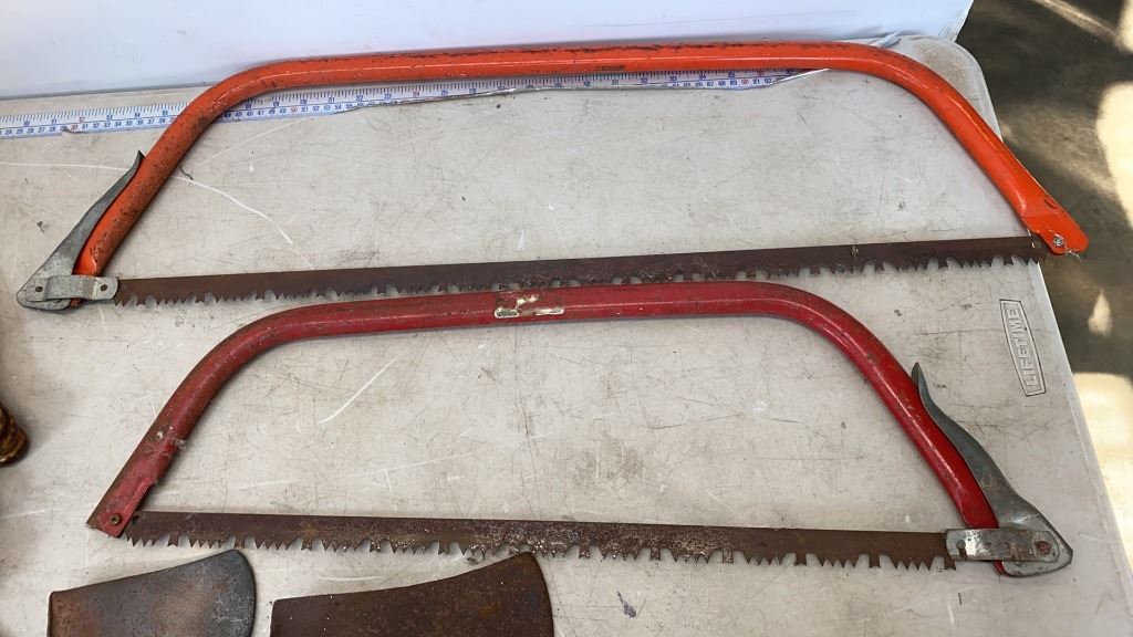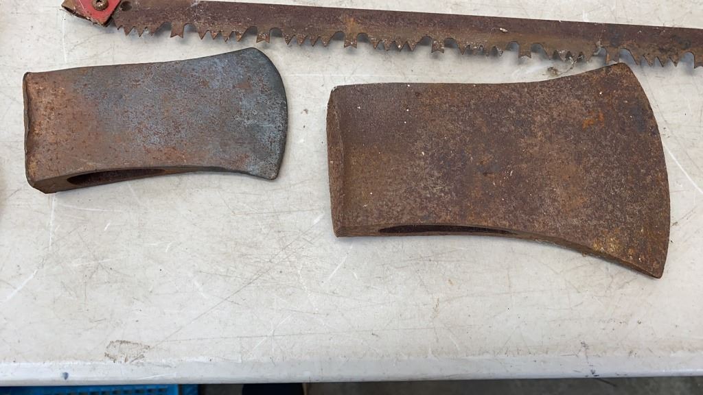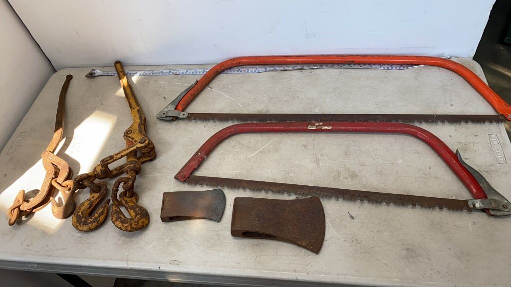 2 CHAIN CINCHES, AXE HEADS AND 2 METAL BOW SAWS
