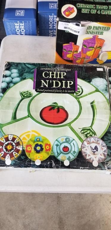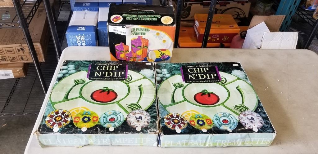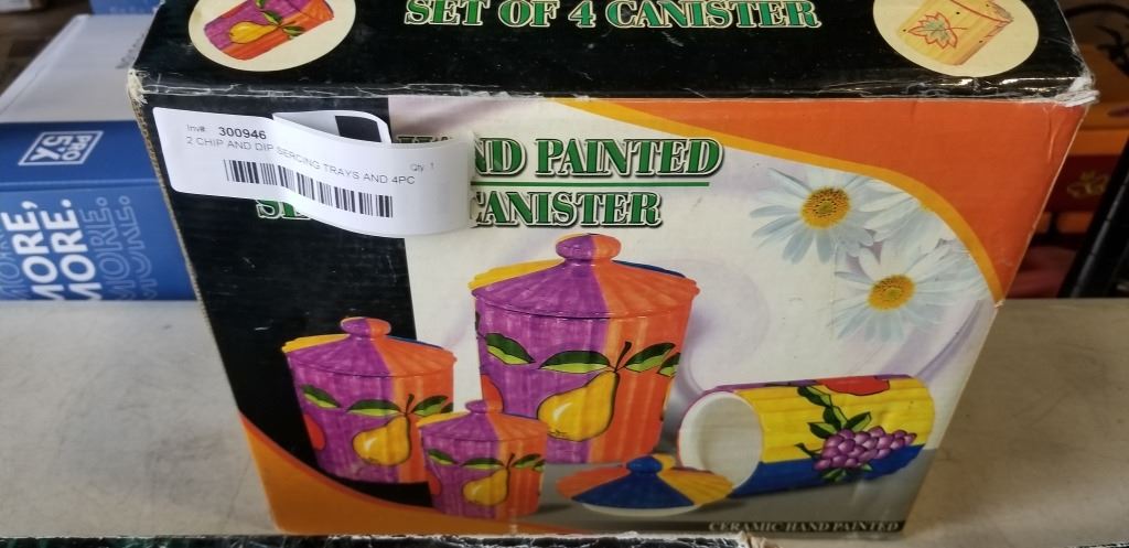 2 CHIP AND DIP SERCING TRAYS AND 4PC LIDDED CANNISTER SET