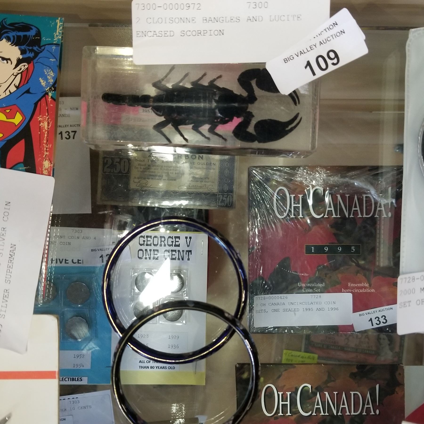 2 CLOISONNE BANGLES AND LUCITE ENCASED SCORPION