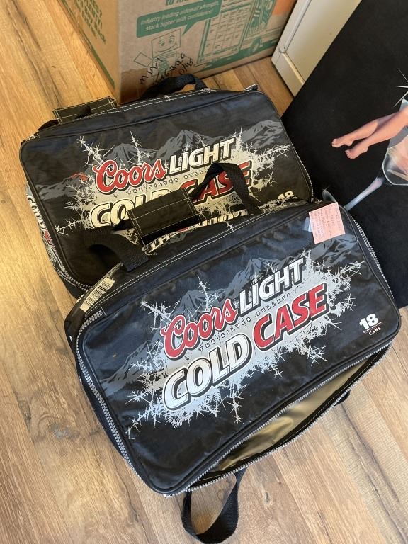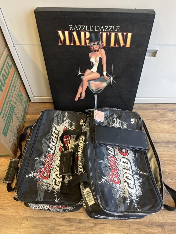 2 COORS LIGHT COLD CASES/ COOLER BAGS PLUS NEW MOLSON CANADIAN COASTER PACK AND MARTINI RAZZLE DAZZLE POSTER