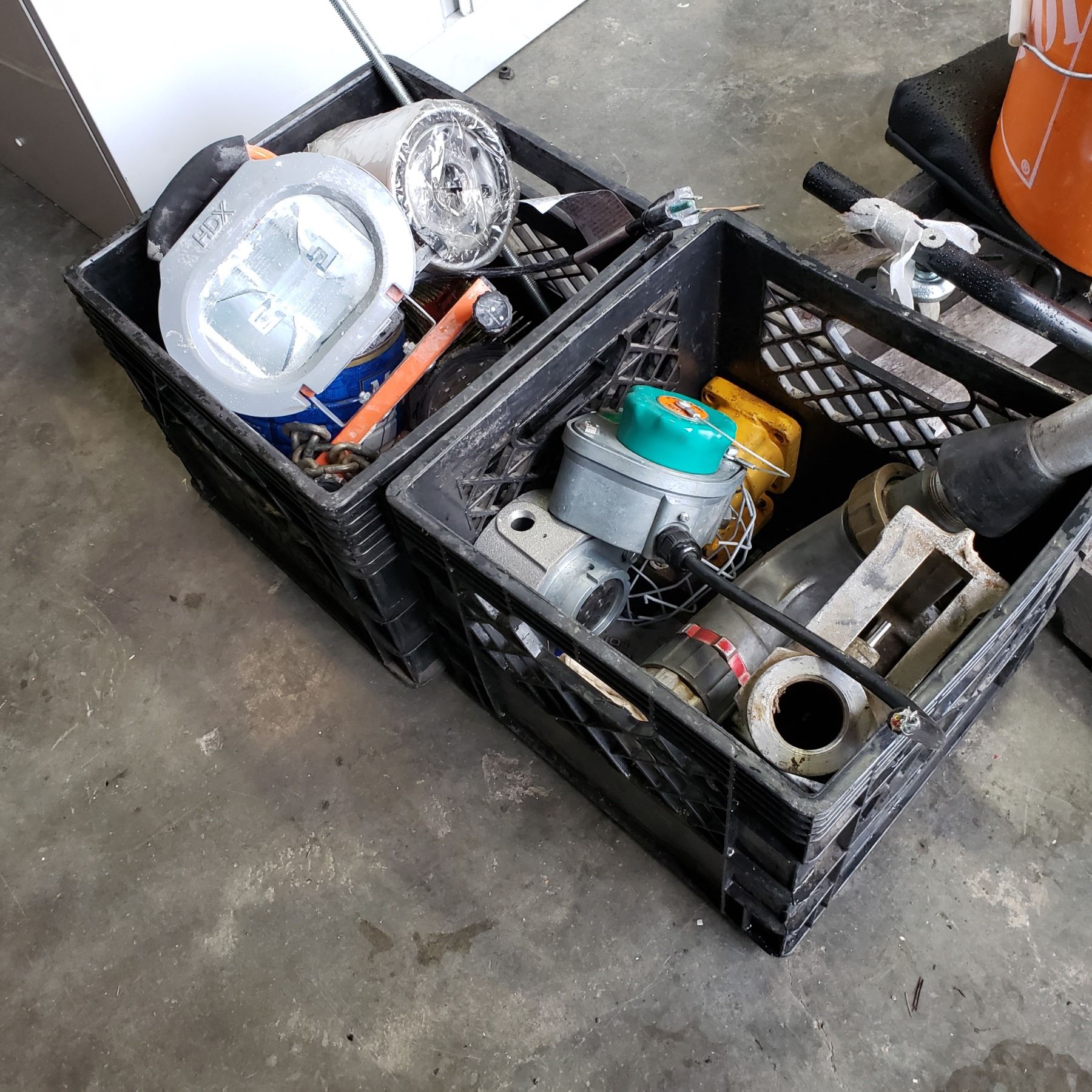 2 CRATES OF FUEL NOZZLES, SHOP LIGHT, AND CHAIN