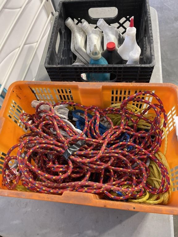 2 CRATES OF SHOP FLUIDS AND BUNGY CORDS