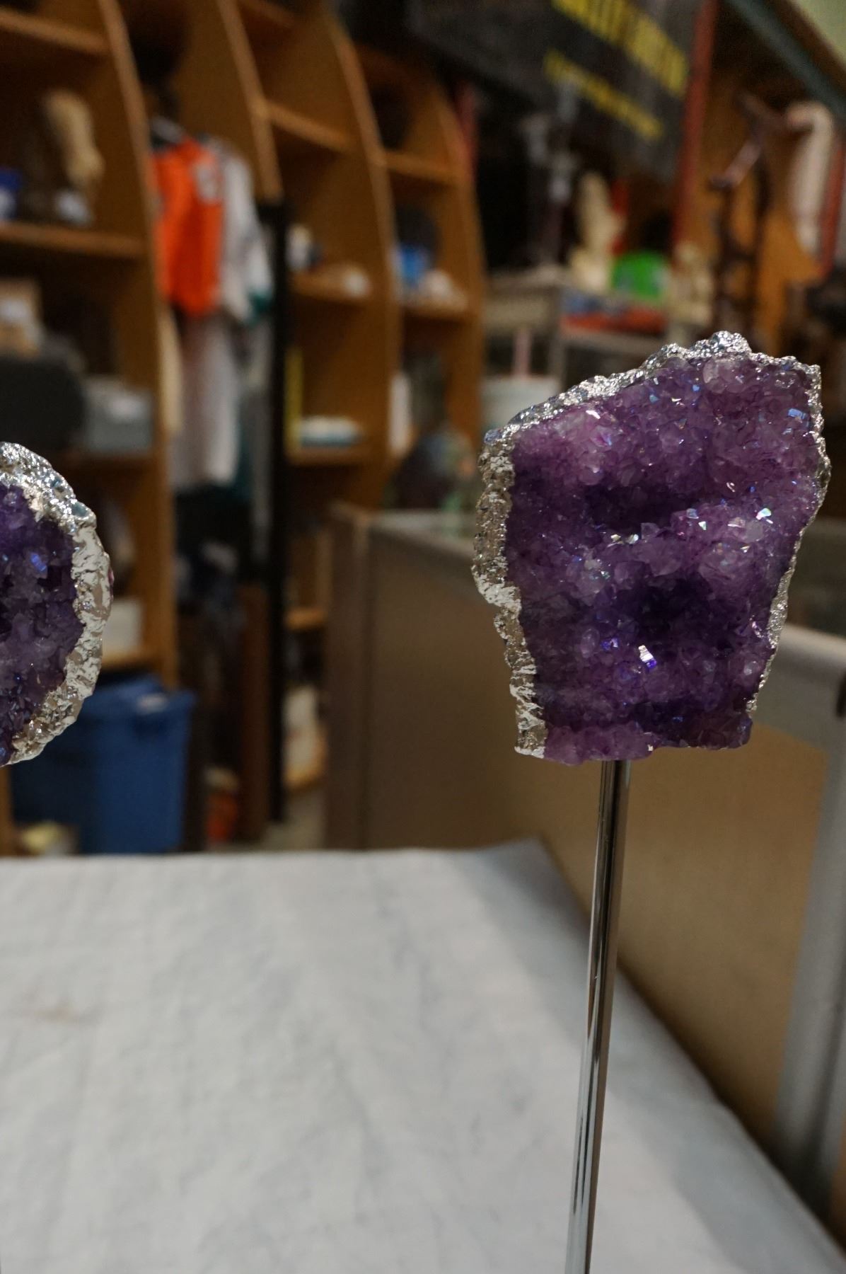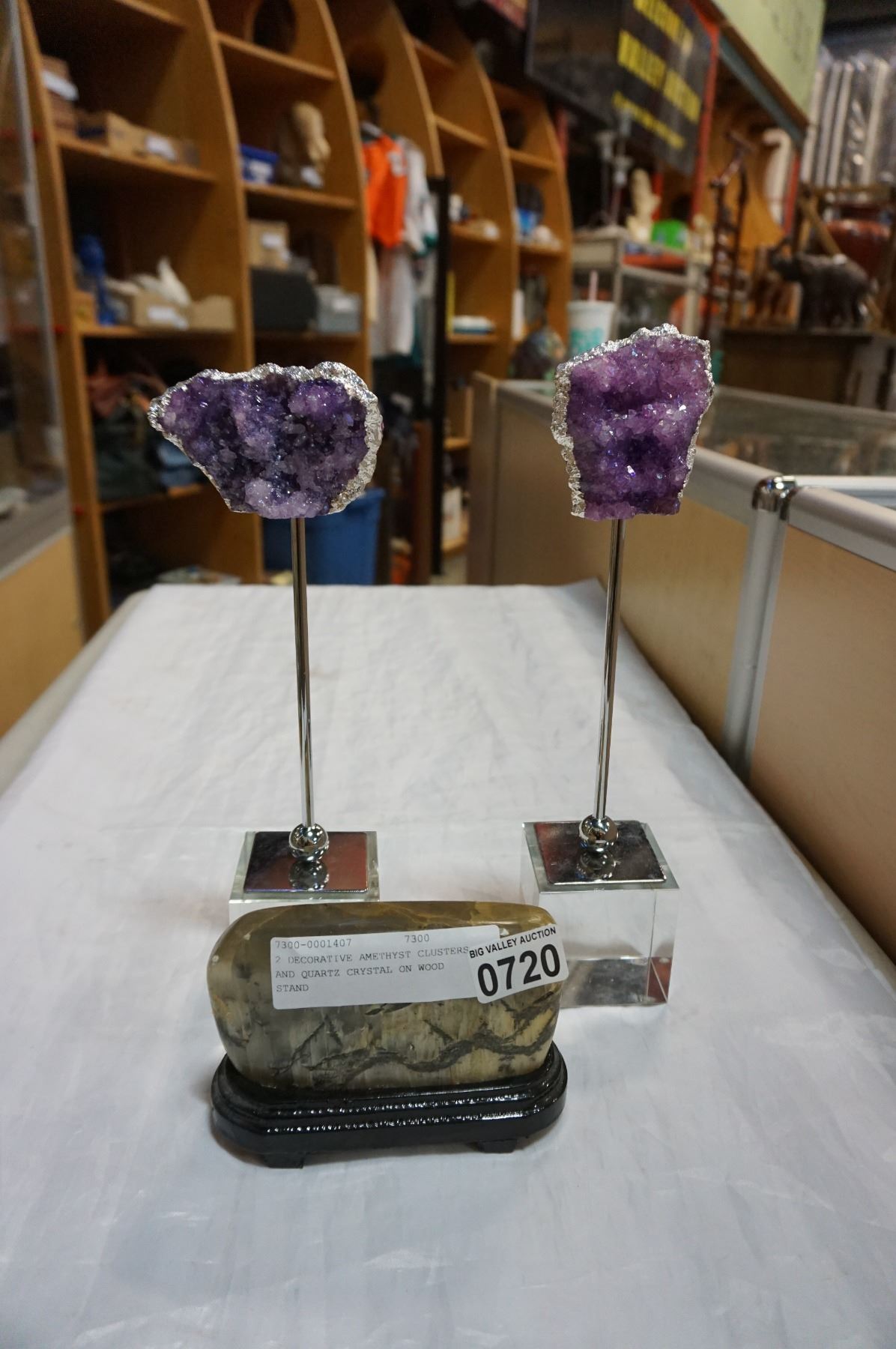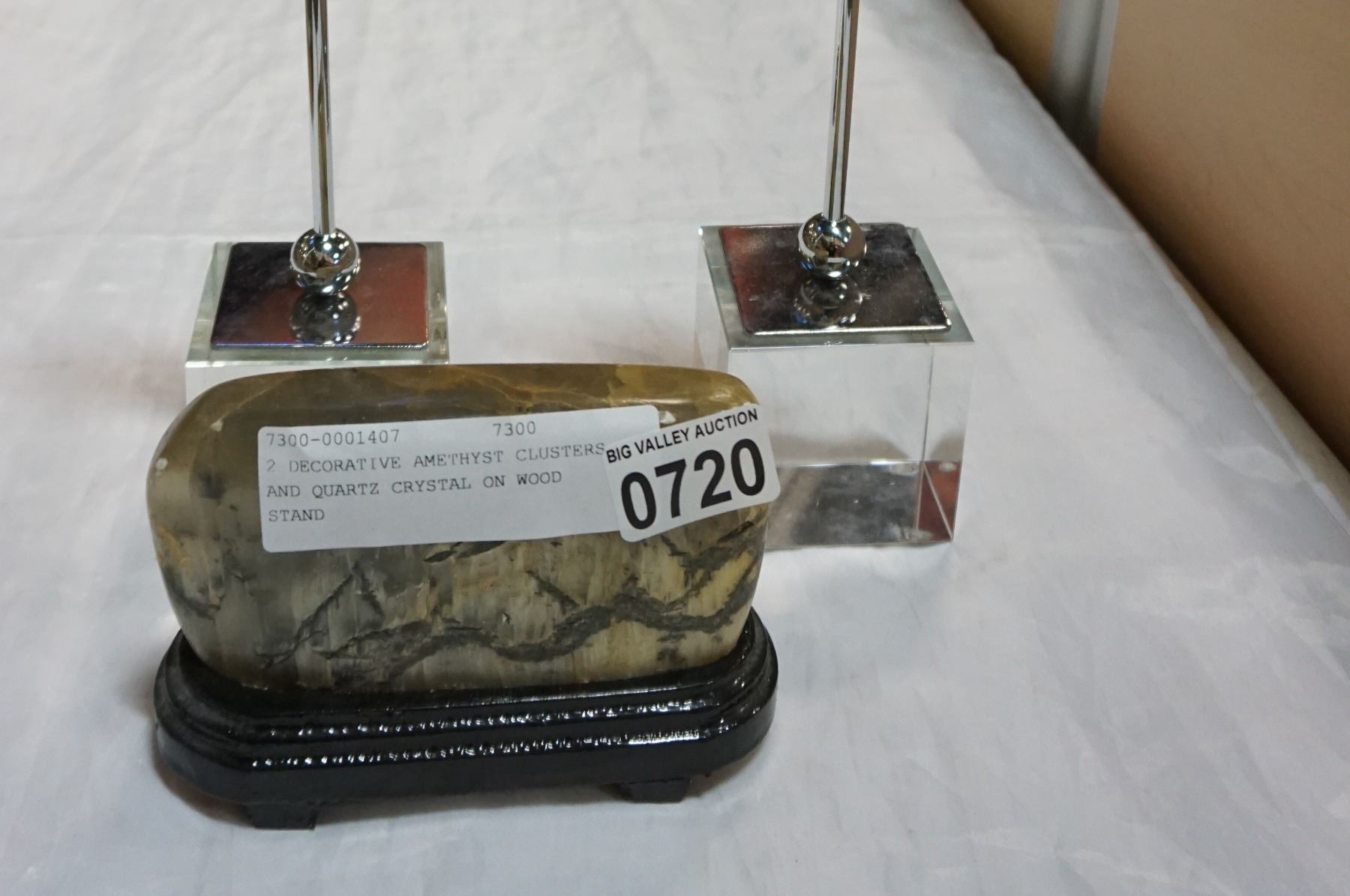 2 DECORATIVE AMETHYST CLUSTERS AND QUARTZ CRYSTAL ON WOOD STAND