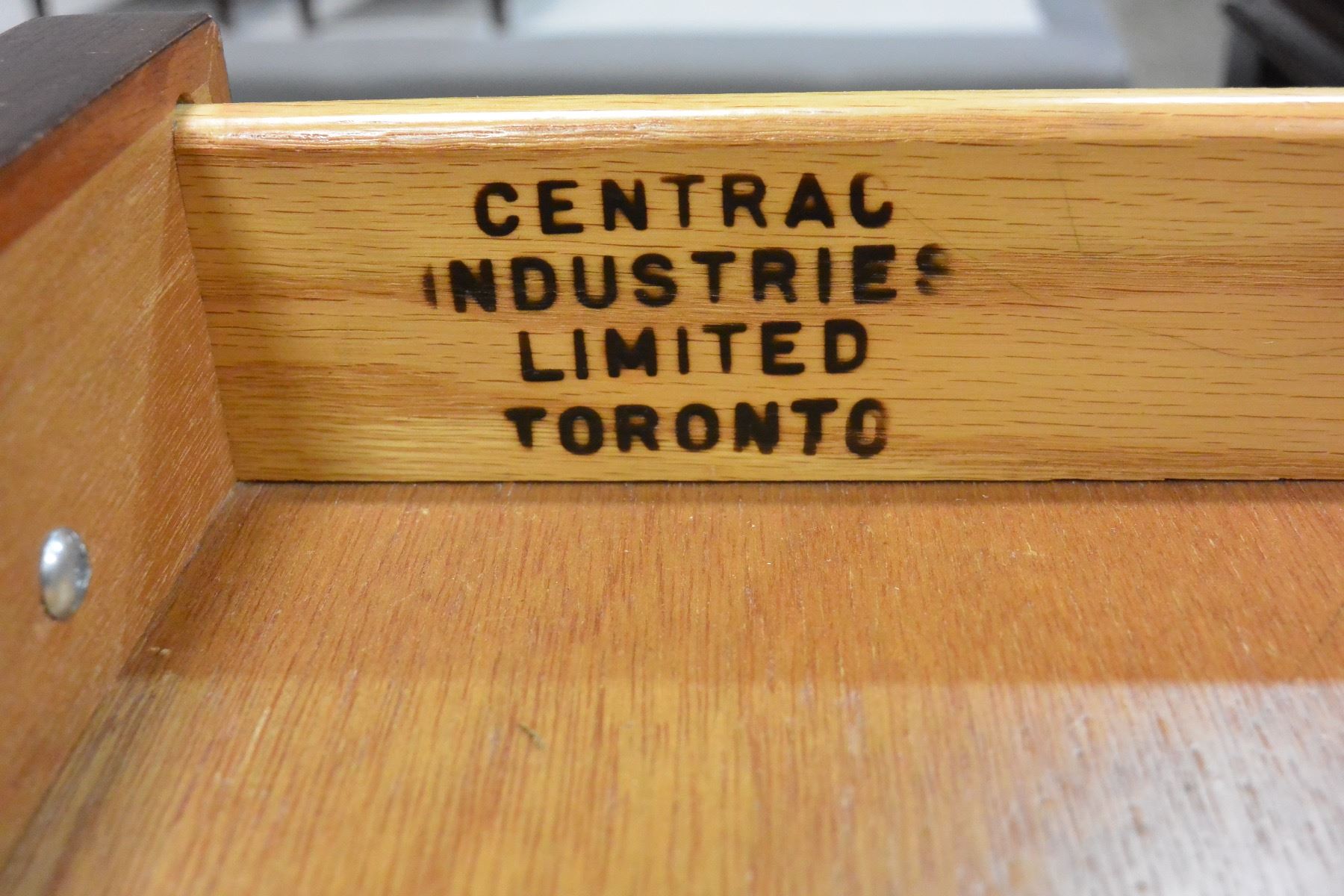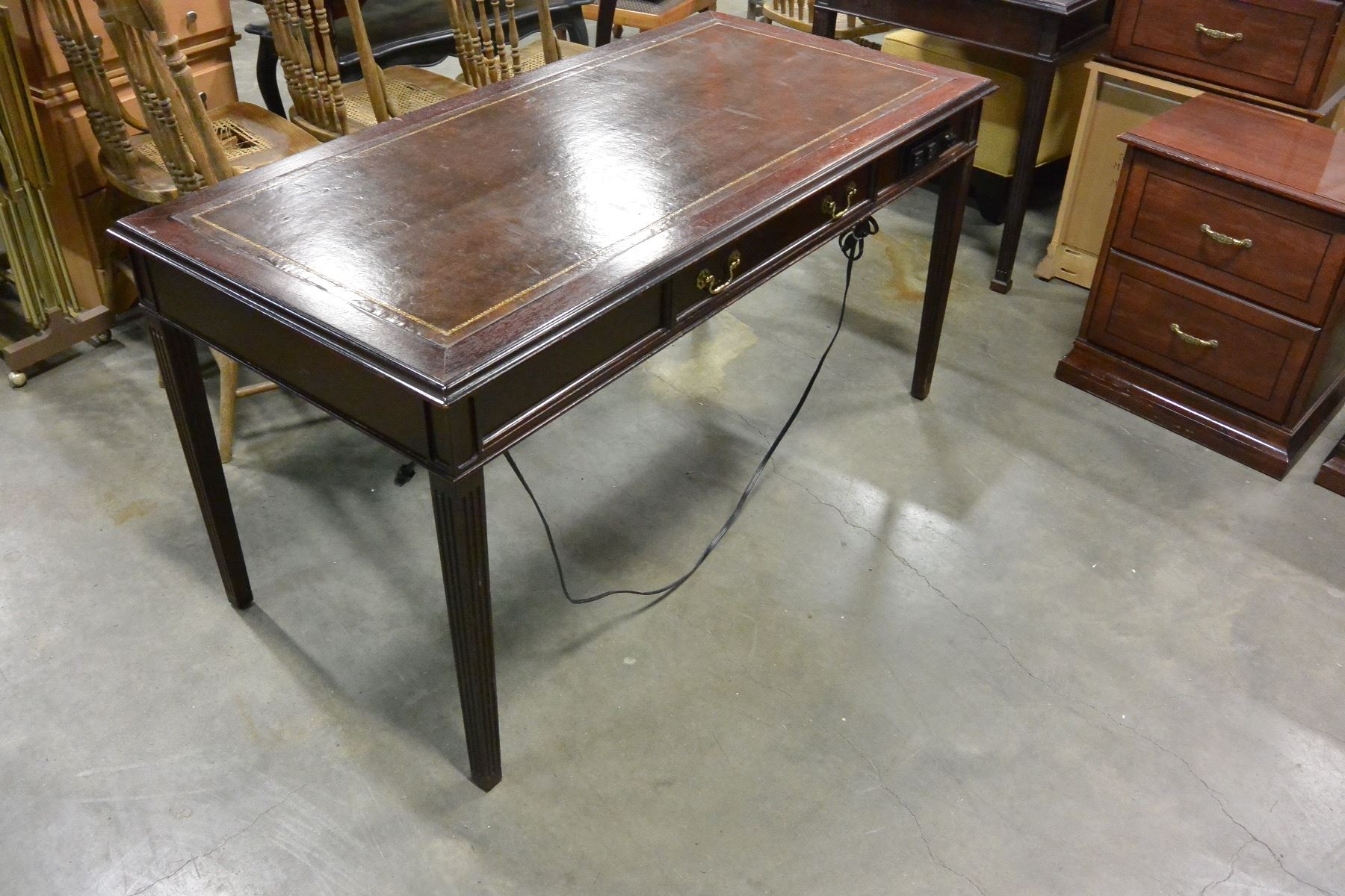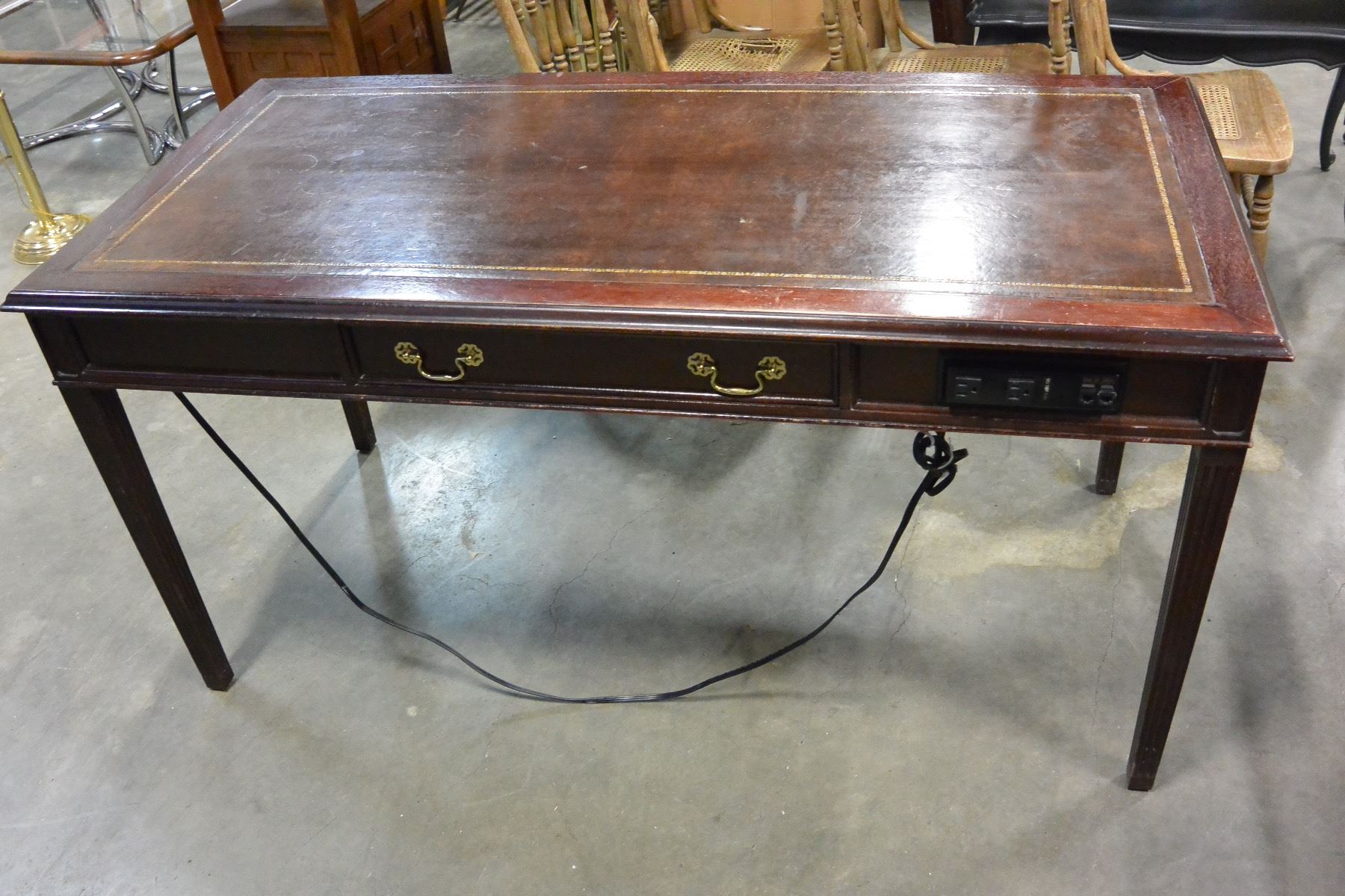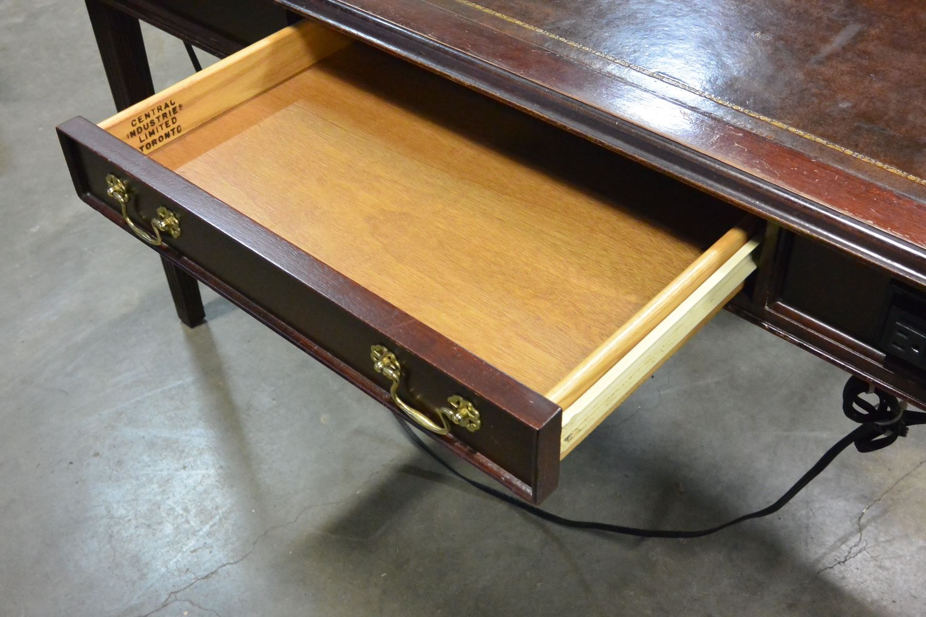 2 DRAWER DARK MAHOGANY TABLE WITH LEATHER INSERT AND OUTLETS