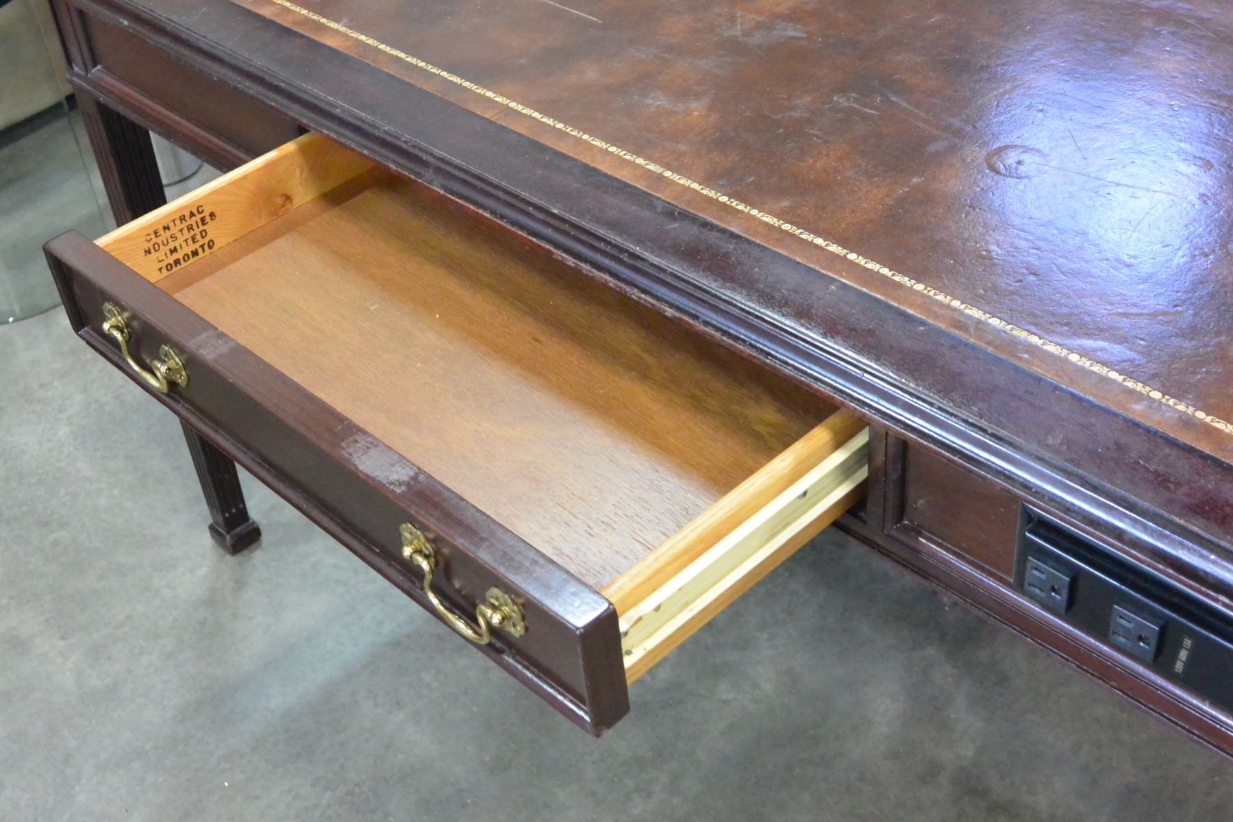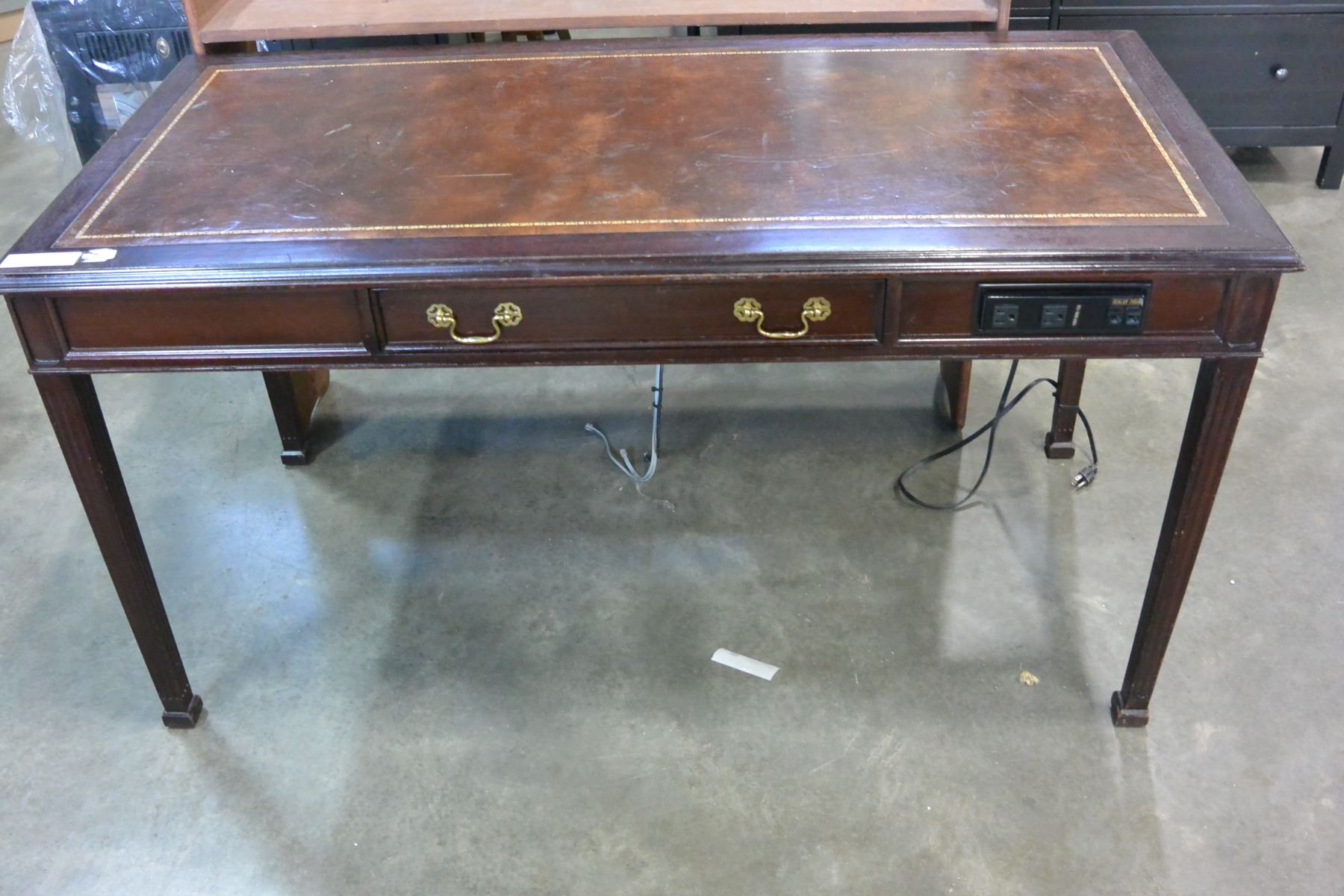 2 DRAWER DARK MAHOGANY TABLE WITH LEATHER INSERT AND OUTLETS