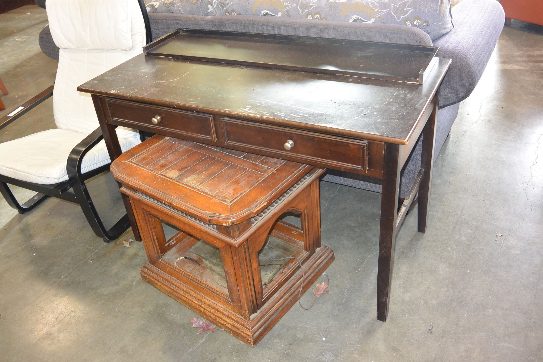2 DRAWER DESK AND GLASS AND WALNUT SIDETABLE