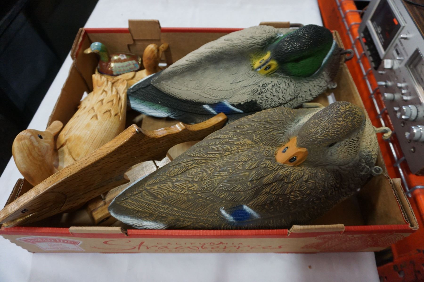 2 DUCK DECOYS, 2 CARVED WOOD DUCKS SIGNED, CARVED FISH, AND METAL DUCK