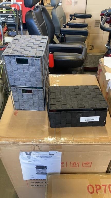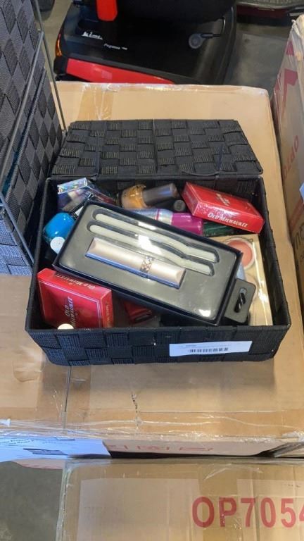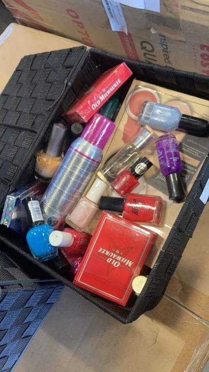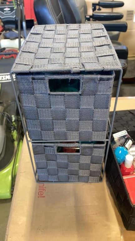 2 FABRIC ORGANIZERS WITH BEAUTY PRODUCTS AND HAIR ROLLERS