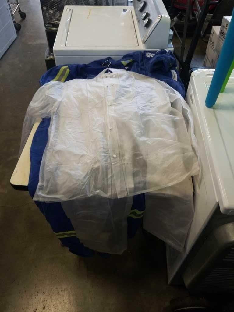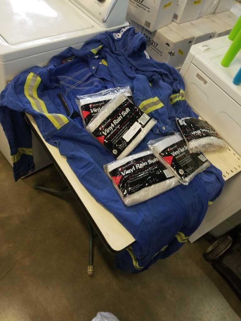 2 FIRE RATED COVERALLS SIZE 46 AND 6 VINYL RAINSUITS