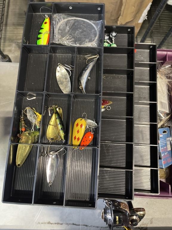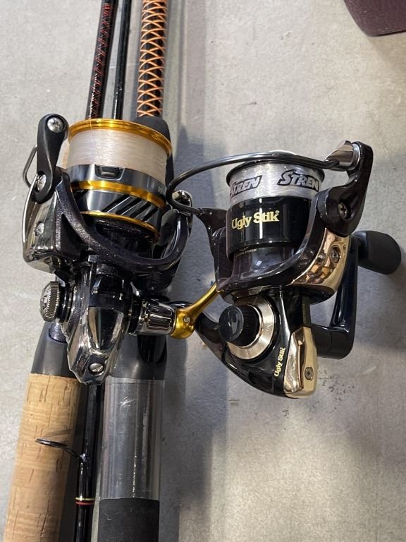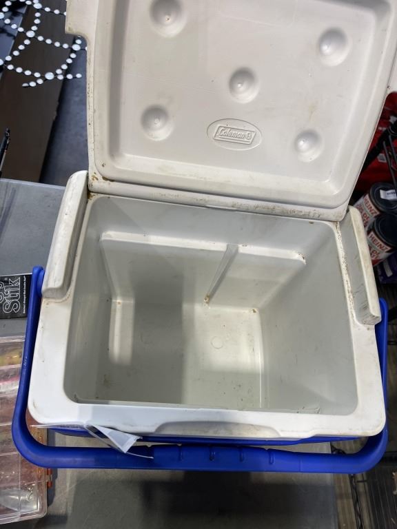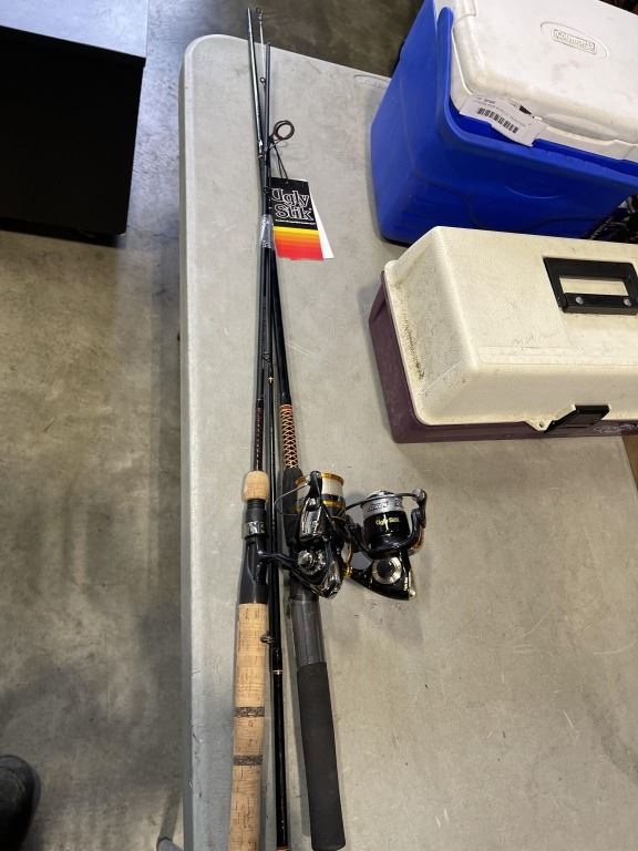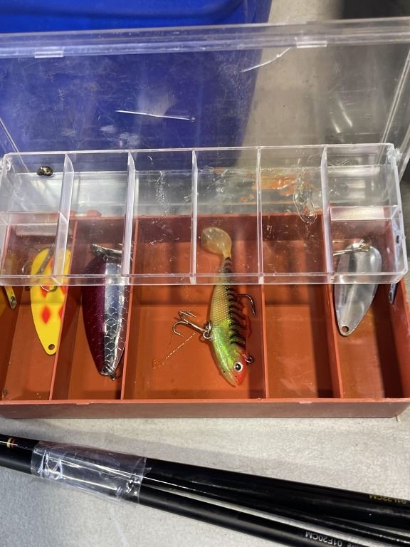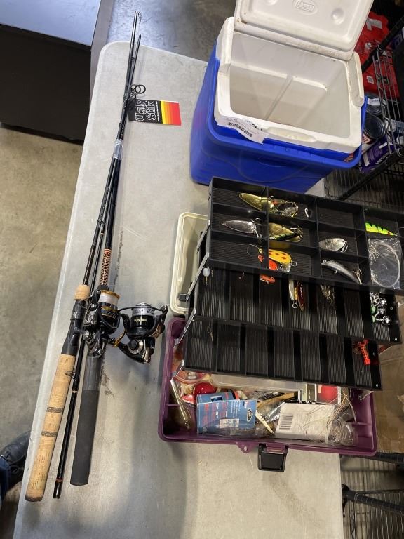 2 FISHING RODS W/ REELS, TACKLE BOX, AND COOLER