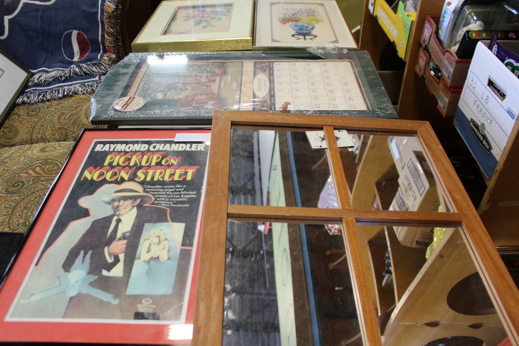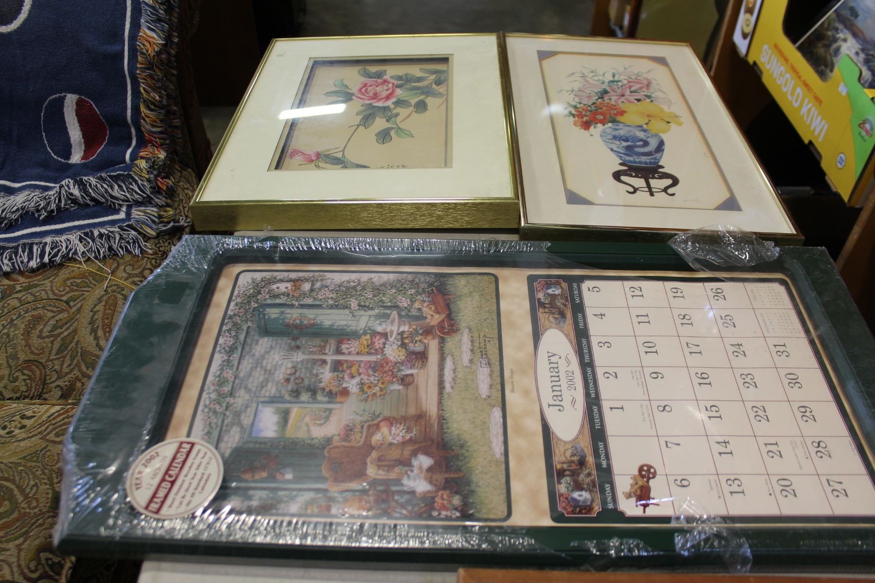 2 FLOWER PRINTS, WOOD MIRROR, COUNTRY CALENDAR AND FRAMED MOVIE POSTER