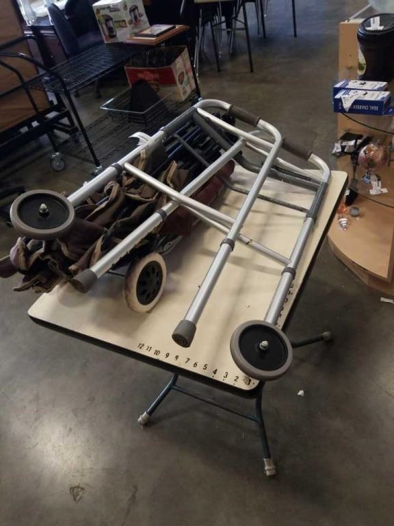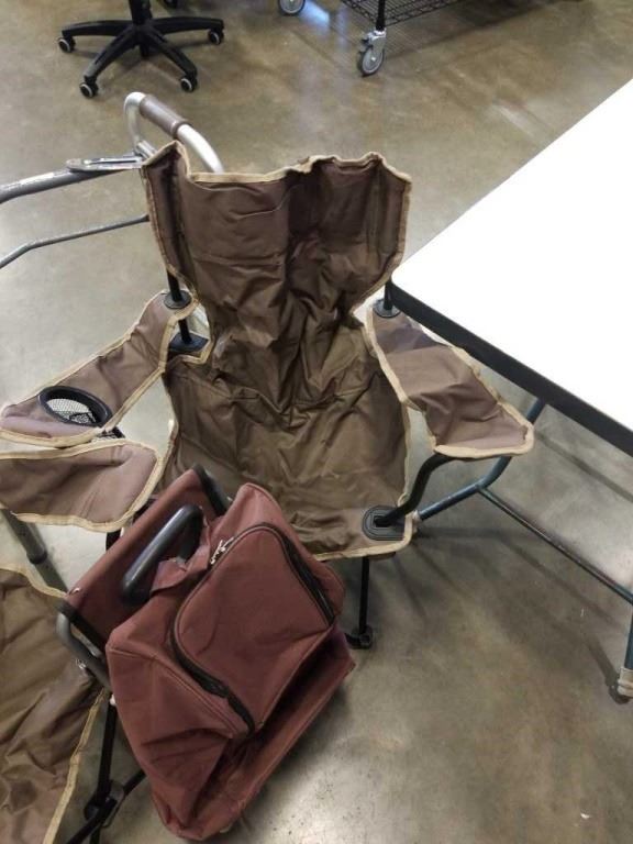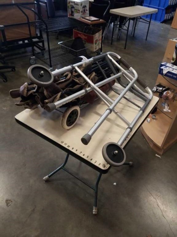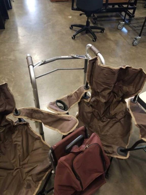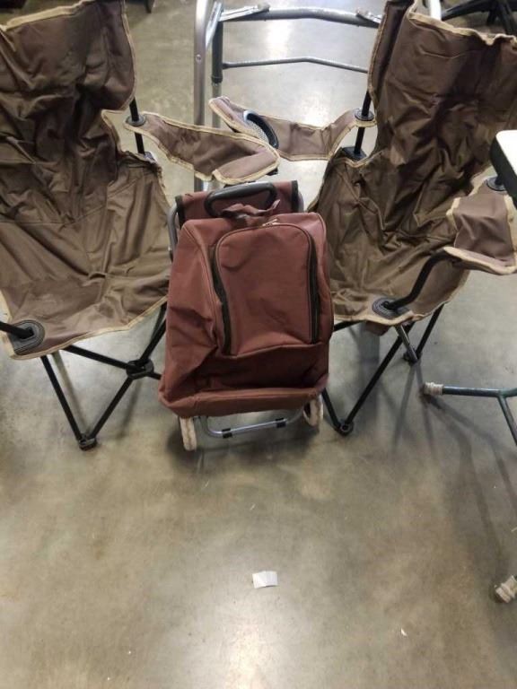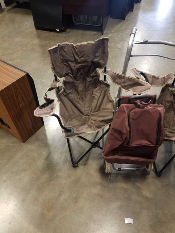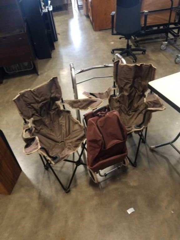 2 FOLDING CAMP CHAIRS, FOLDING CART AND WALKER