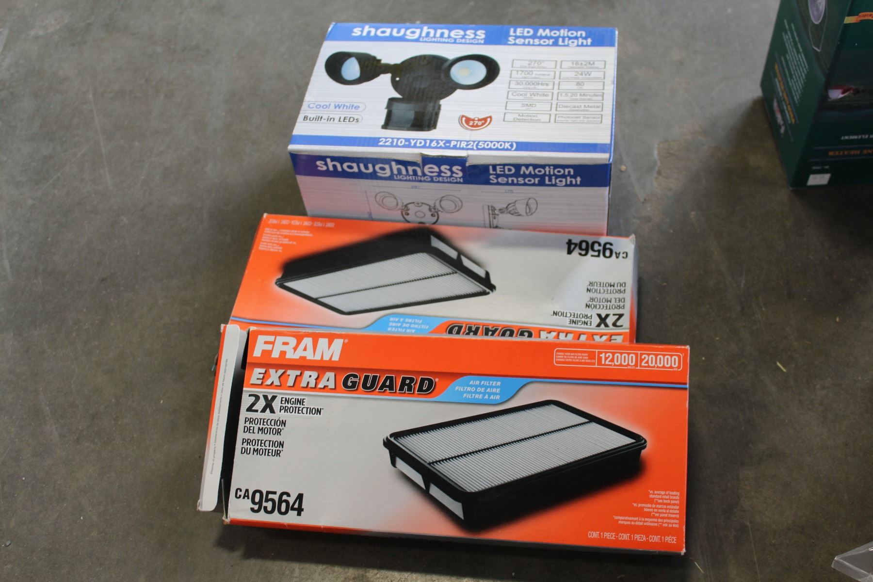 2 FRAM AIR FILTERS AND SHAUGHESS LED MOTION SENSOR LIGHT