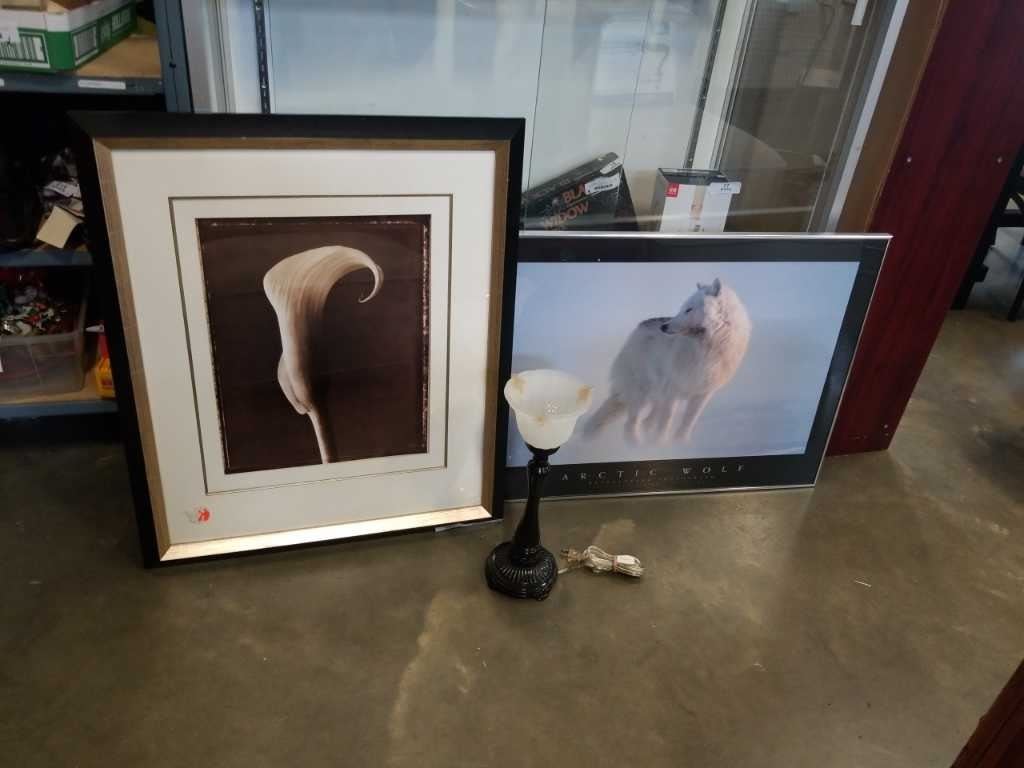 2 FRAMED PICTURES AND LAMP W/ GLASS SHADE