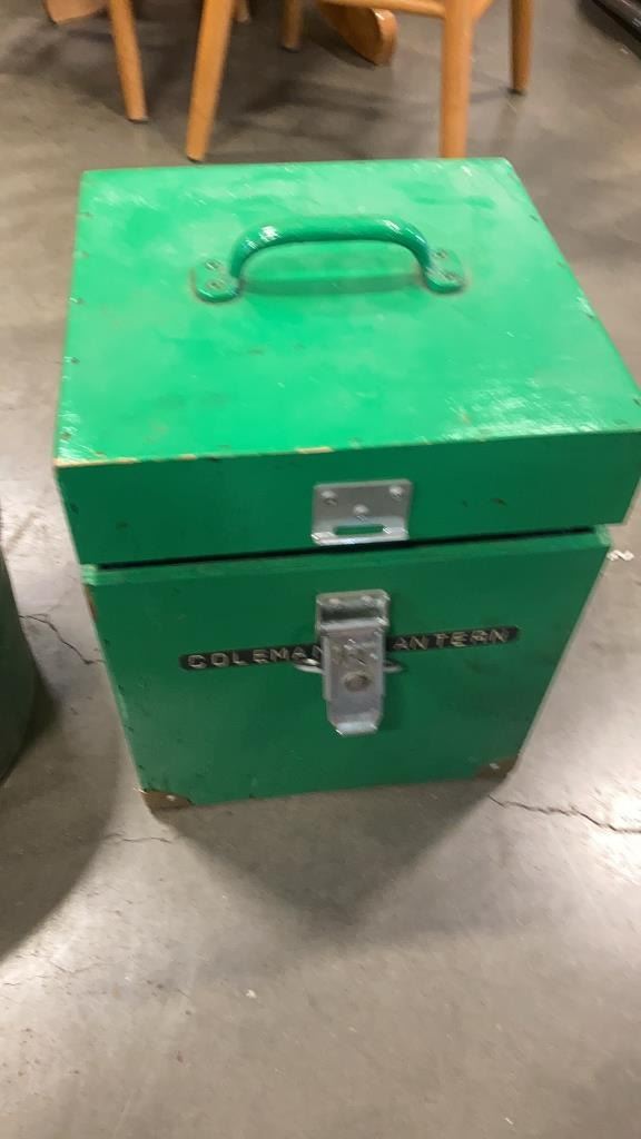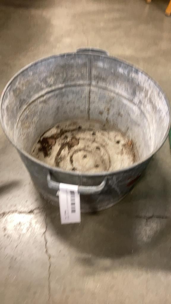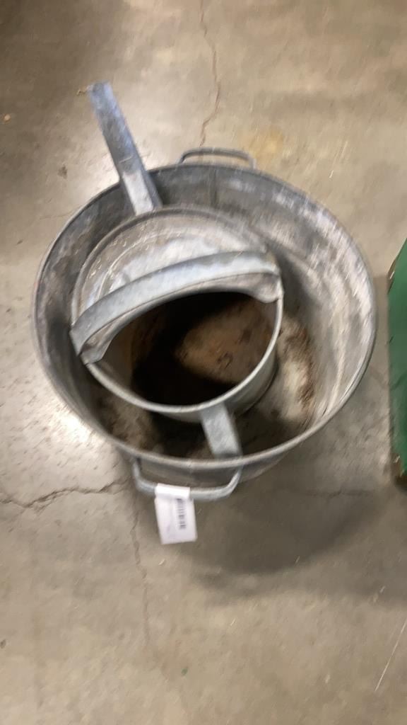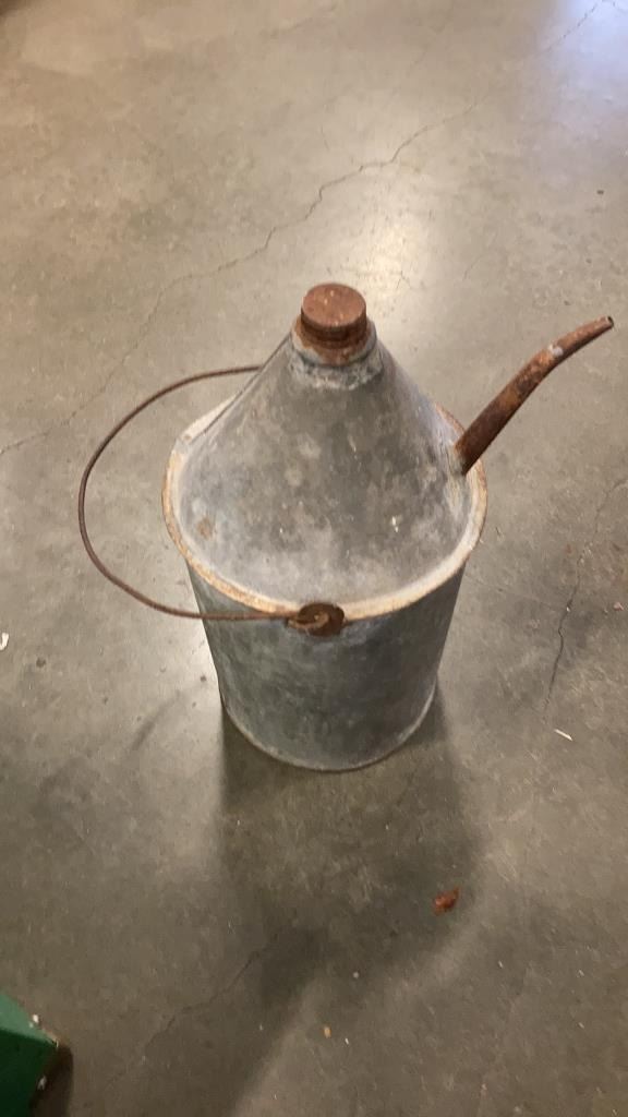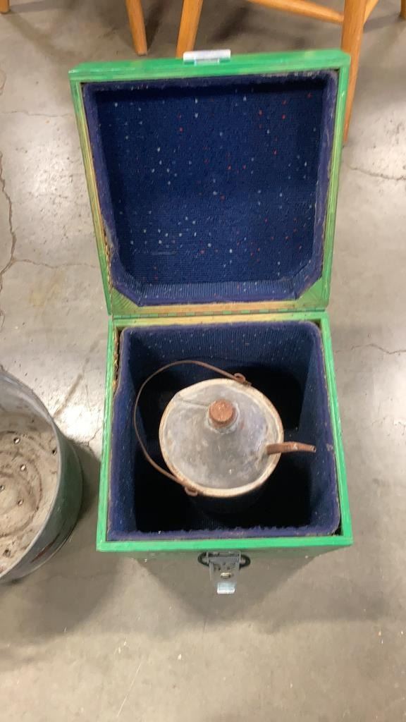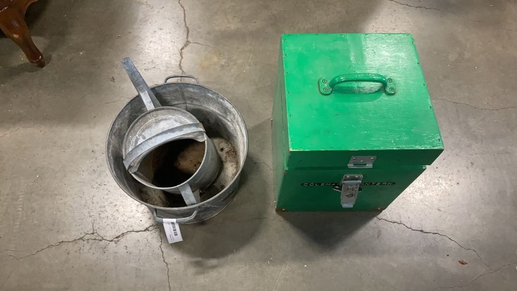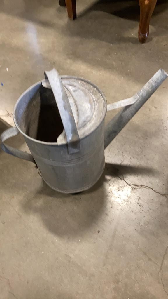 2 GALVANIZED WATERING CANS AND GALVANIZED PAIL AND WOOD CASE