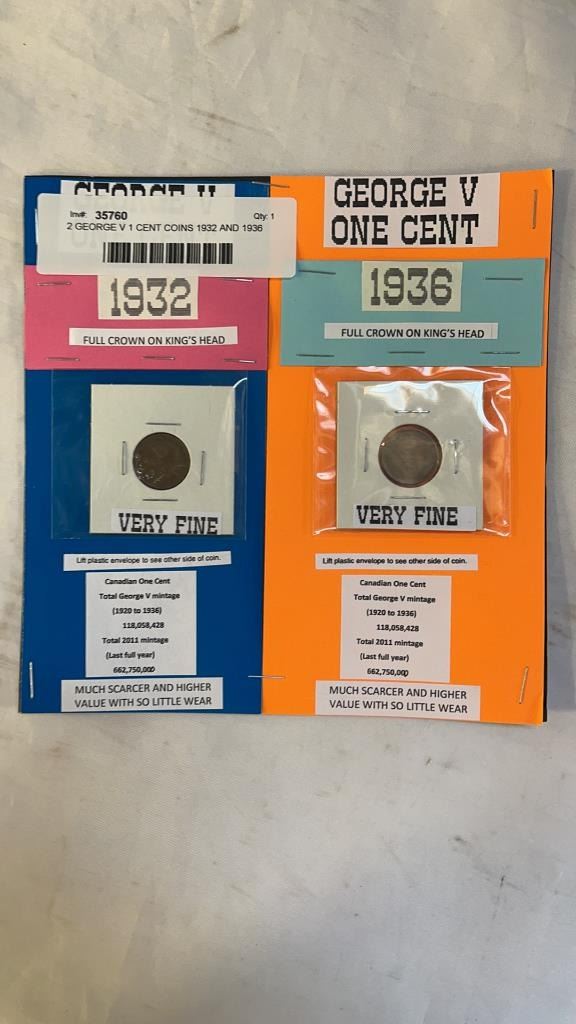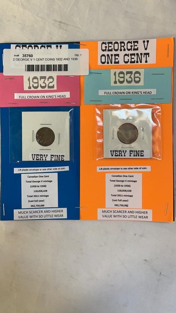 2 GEORGE V 1 CENT COINS 1932 AND 1936