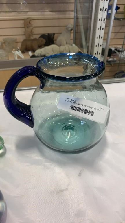 2 GLASS PAPER WEIGHTS, HEAVY GLASS PITCHER, AND MICKEY MOUSE FIGURE