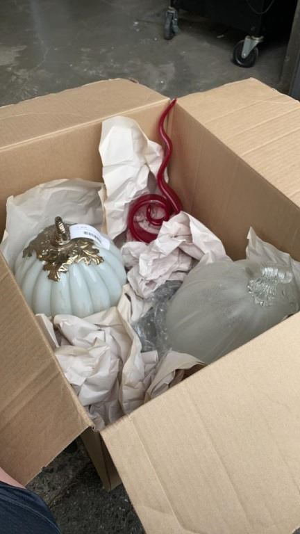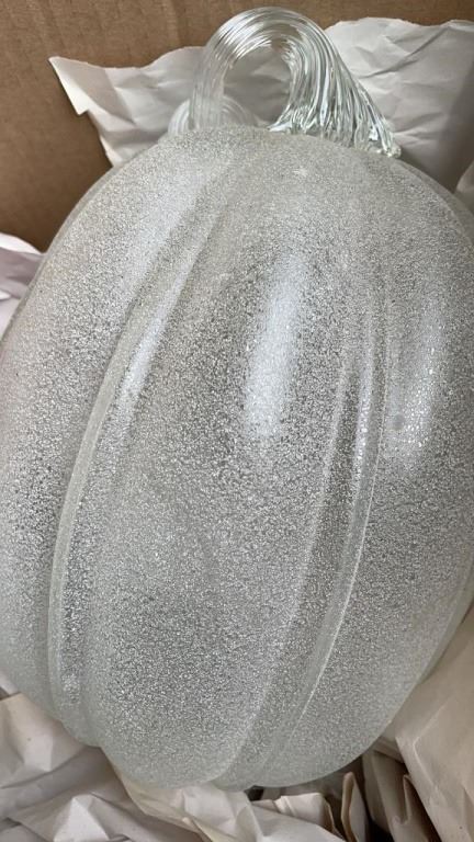 2 GLASS PUMPKINS AND RED ART GLASS DECORATION