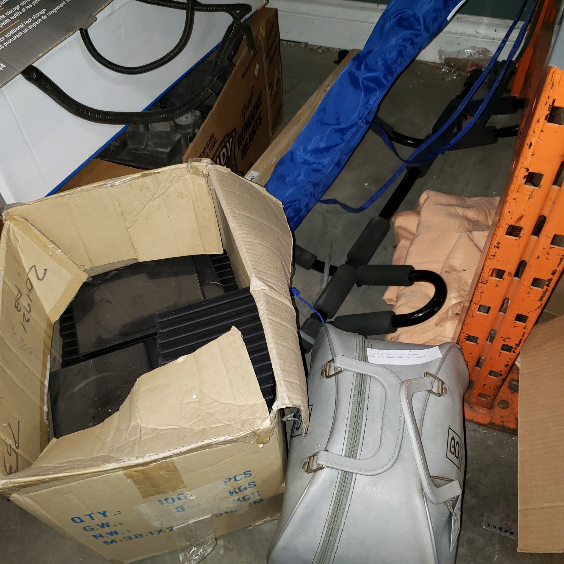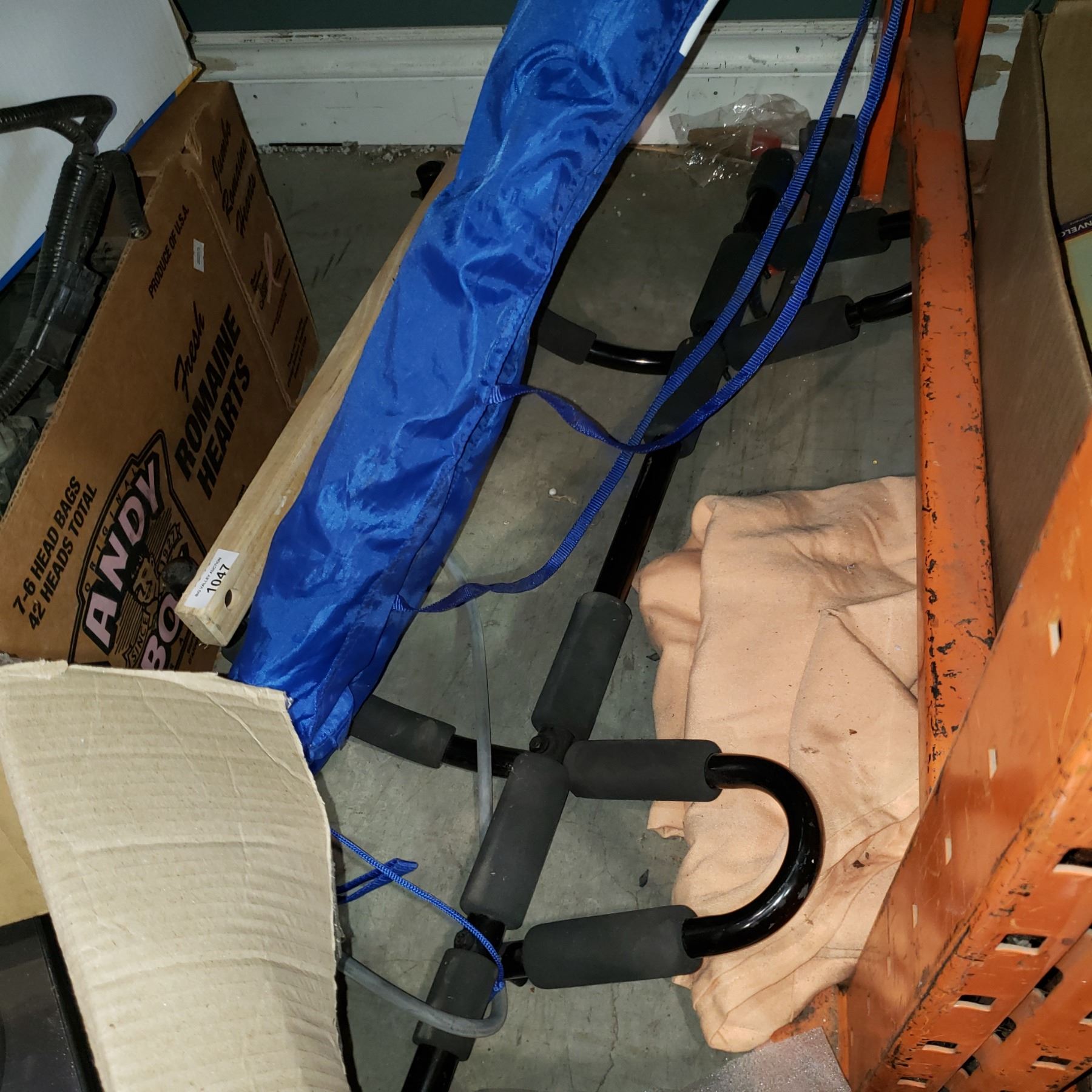 2 GYM STICS, CHIN UP BAR, BOWLING BALL, AND DVD CASES