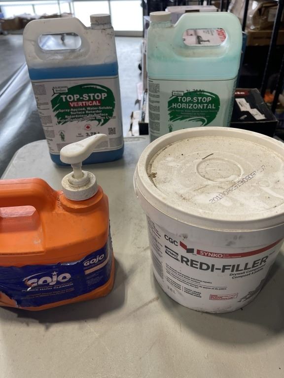 2 HALF EMPTY JUGS OF CONCRETE FORM RELEASE AND TOTE OF ASSORTED FLUIDS