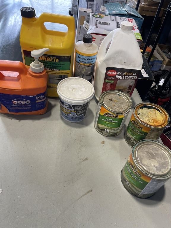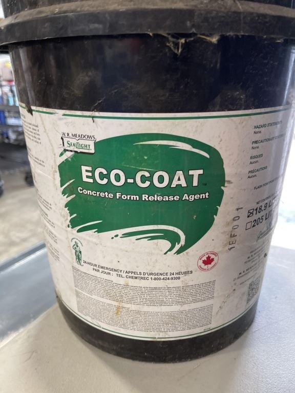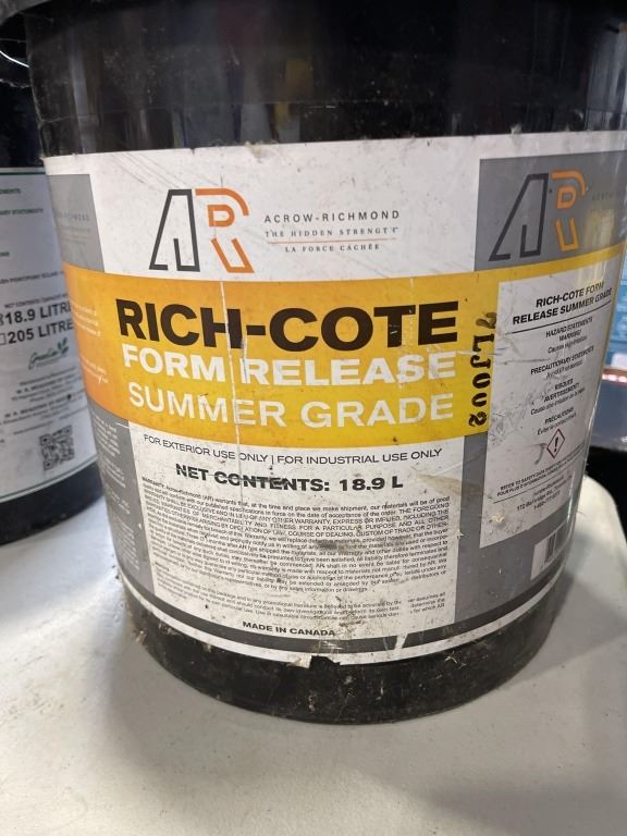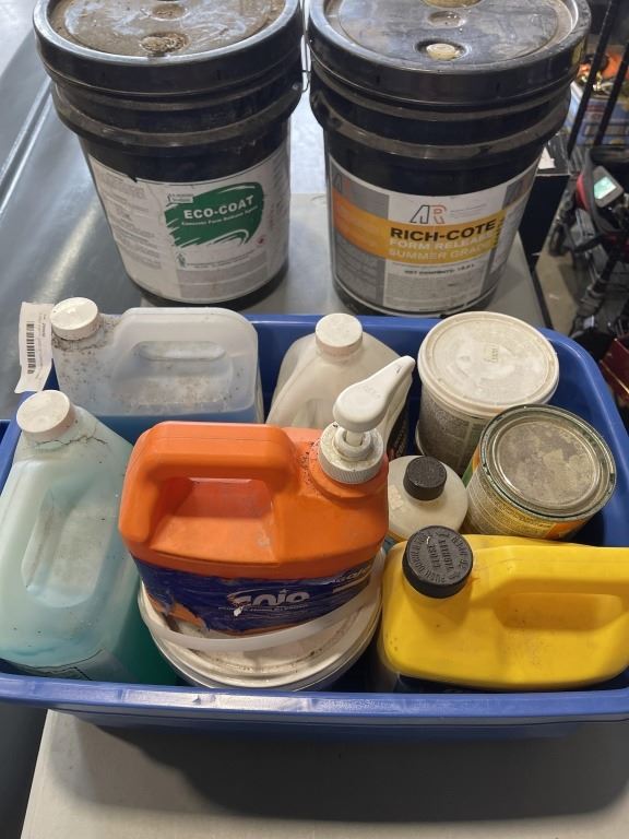 2 HALF EMPTY JUGS OF CONCRETE FORM RELEASE AND TOTE OF ASSORTED FLUIDS