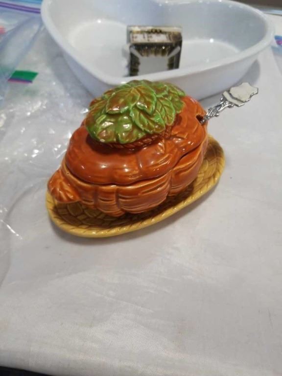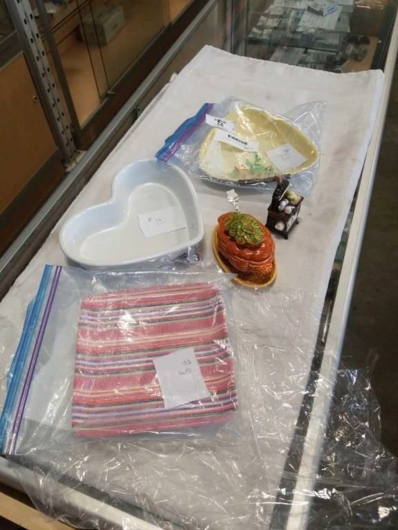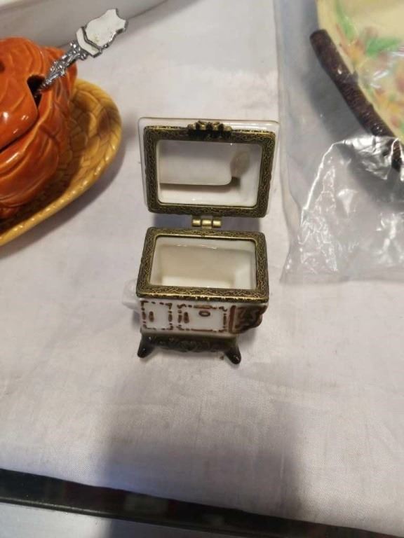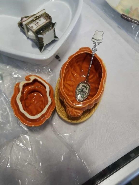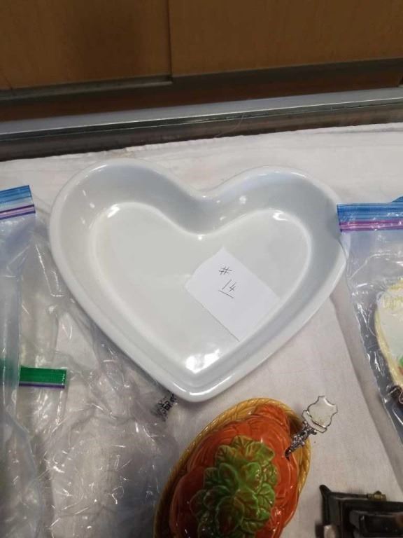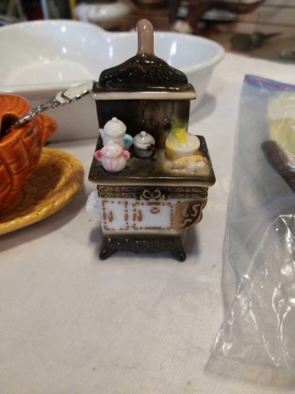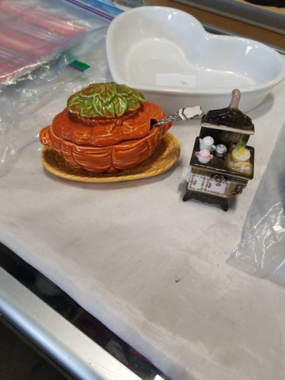 2 HEART SHAPED SERVING PLATES WITH HONEY DISH AND KITCHEN STOVE FIGURE