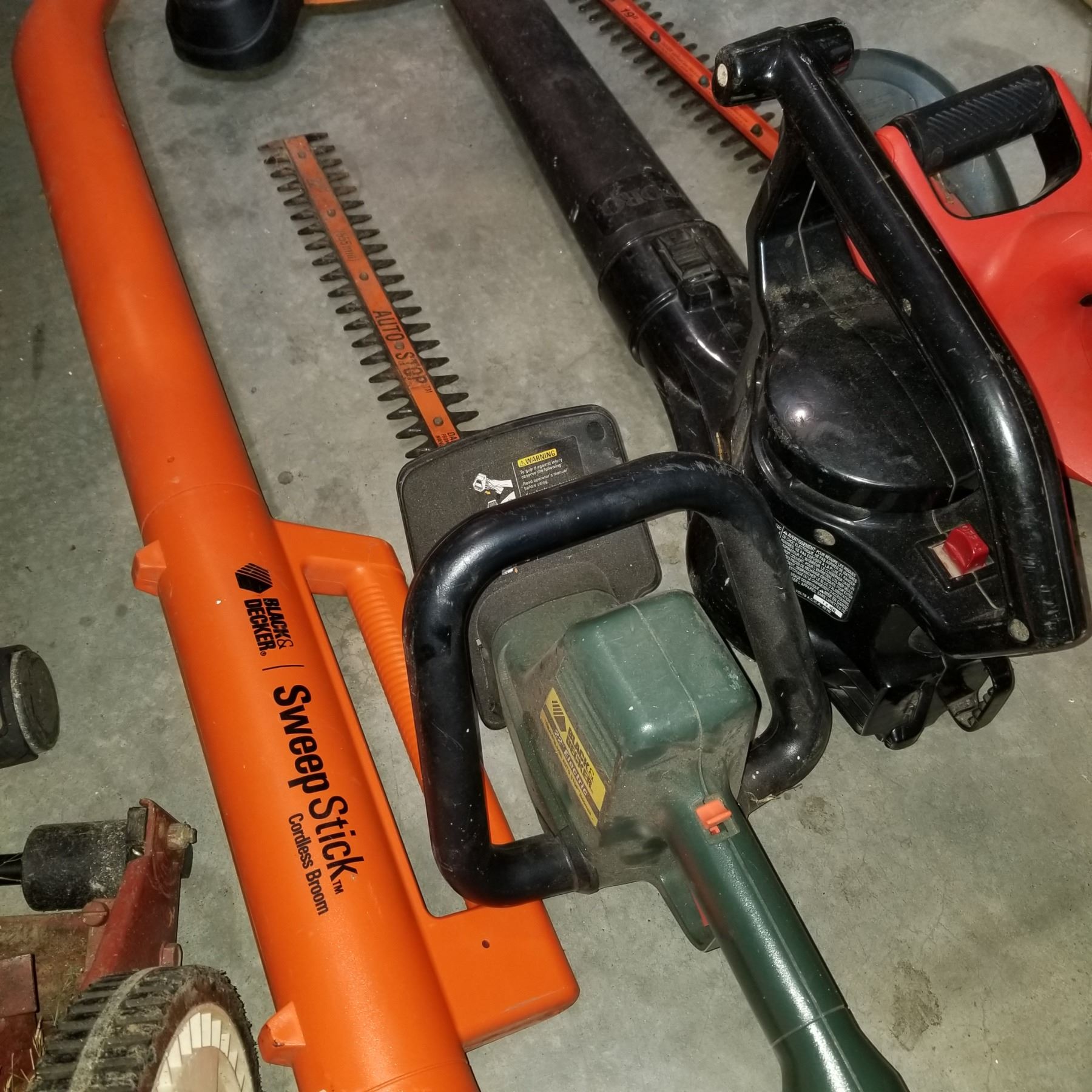 2 HEDGE TRIMMERS, TORO LEAF BLOWER AND BLACK AND DECKER SWEEP STICK CORDLESS BROOM