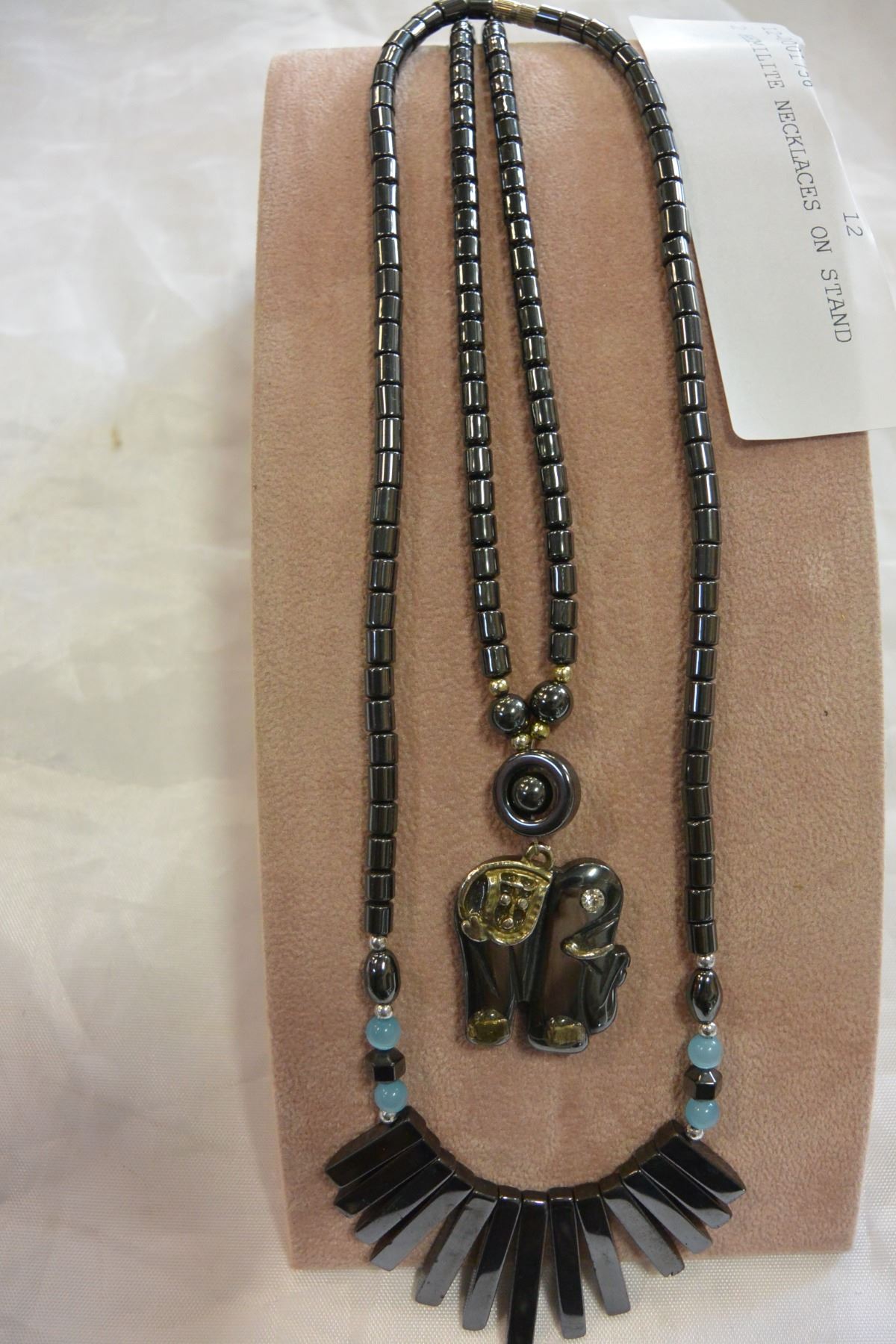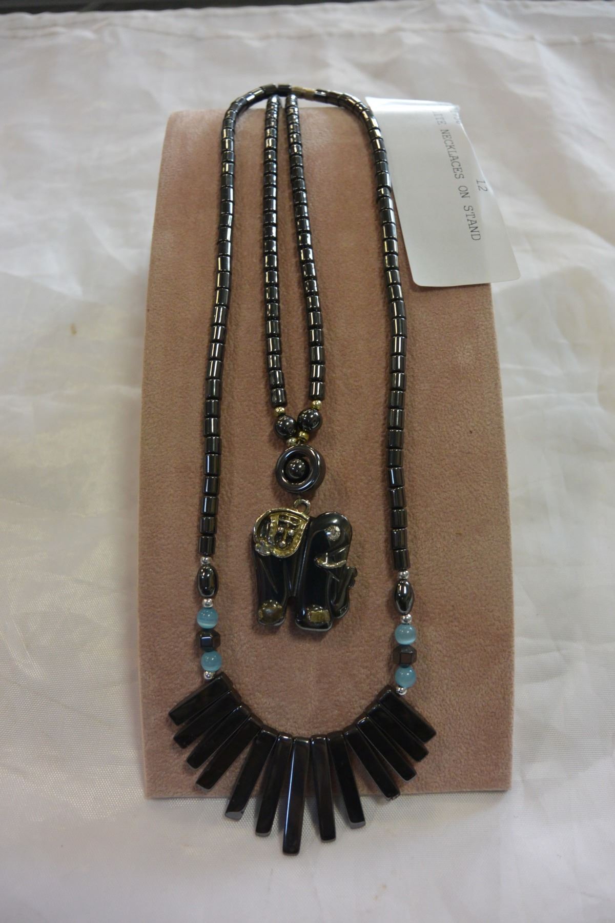 2 HEMILITE NECKLACES ON STAND