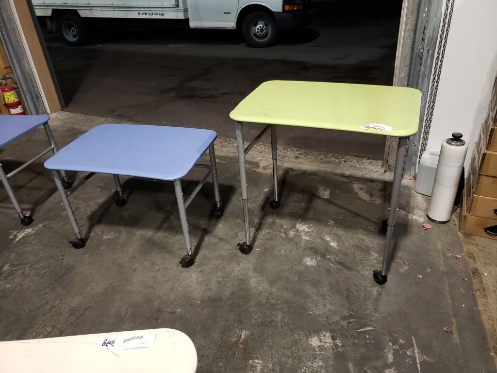 2 HERMAN MILLER ADJUSTABLE HEIGHT ROLLING WORKSTATION / STANDS - GREEN AND BLUE