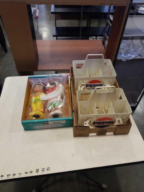 2 KIMMIE FIGURAL COIN BANKS, 2 VINTAGE PEPSI BOTTLE CADDYS