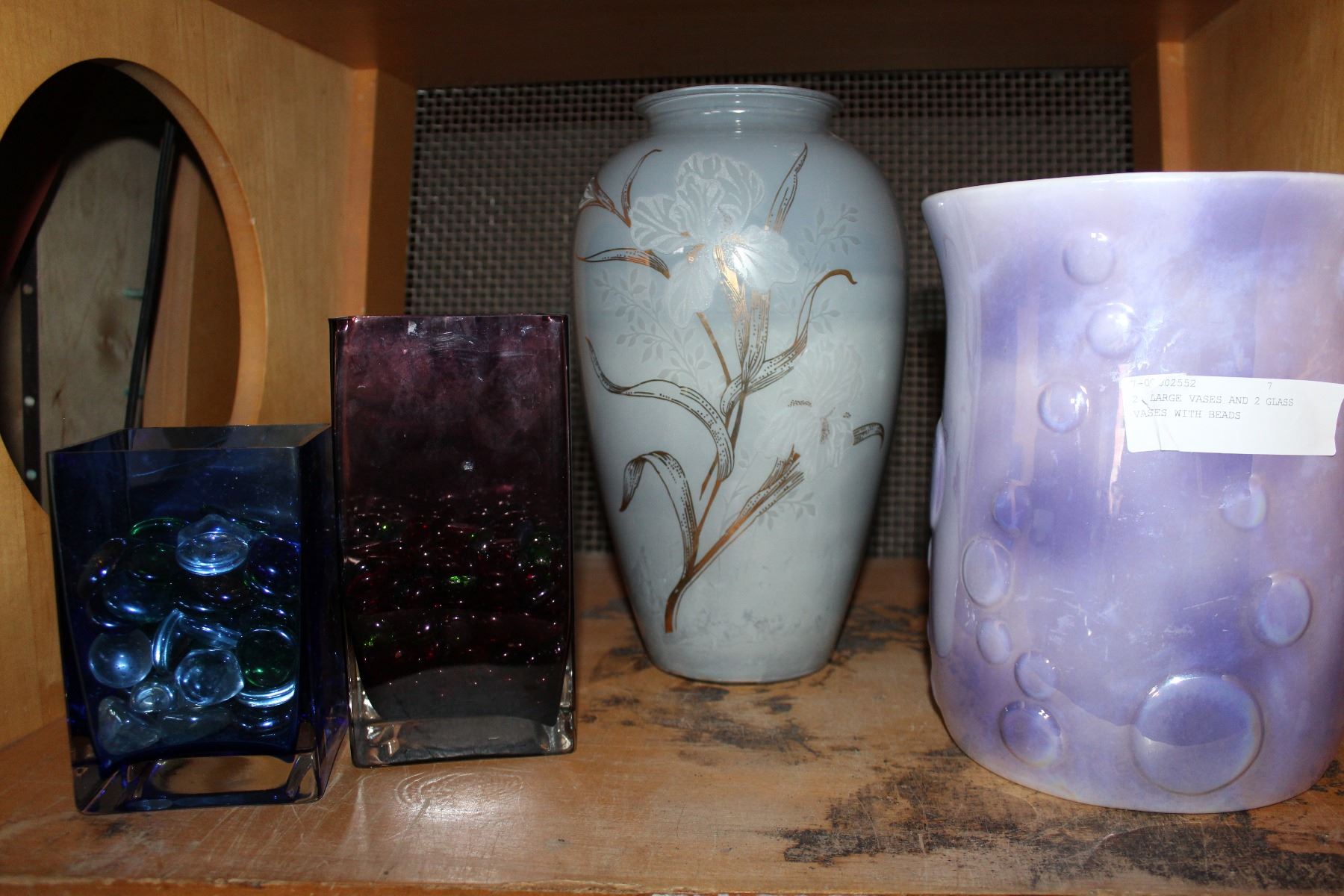 2 LARGE VASES AND 2 GLASS VASES WITH BEADS