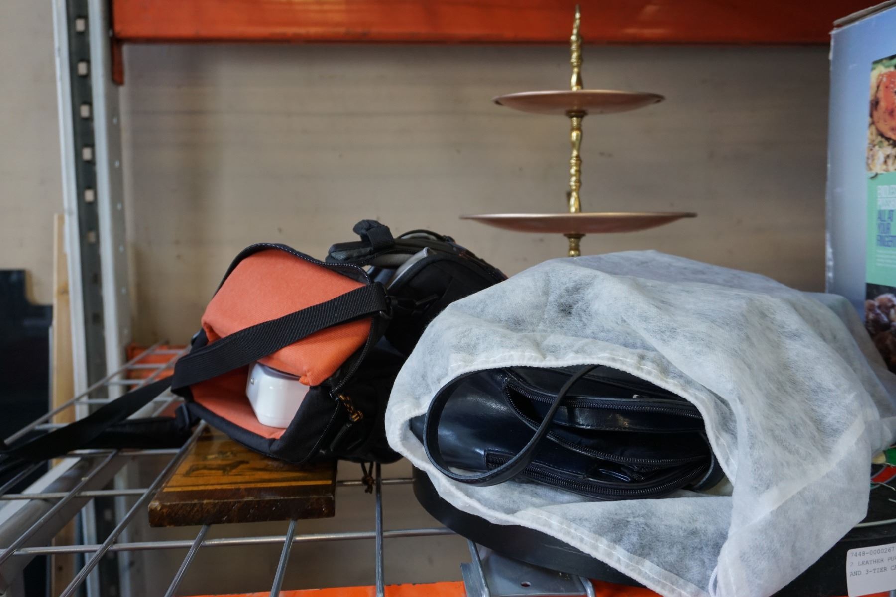 2 LEATHER PURSES, DART BOARD, AND 3-TIER CAKE PLATTER