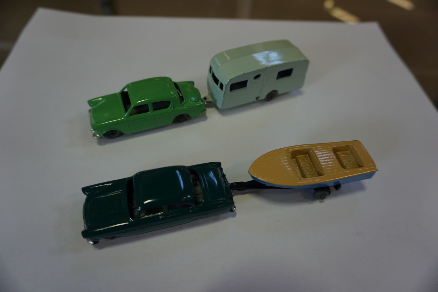 2 LESNEY MADE IN ENGLAND METAL TOY CARS WITH HORSE TRAILER AND BOAT TRAILER