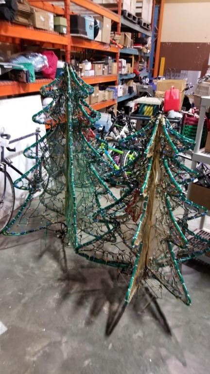 2 LIGHT UP XMAS TREE LAWN ORNAMENTS - APPROX 4 AND 5 FOOT TALL, NEED POWER CORDS