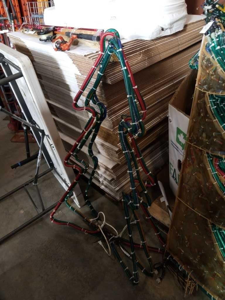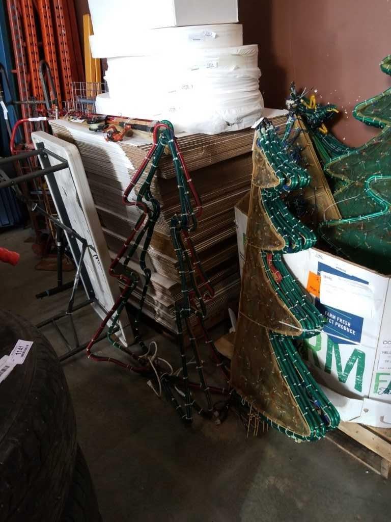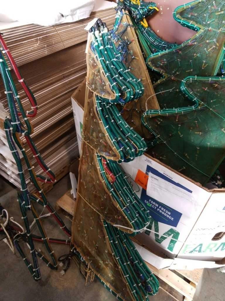2 LIGHT UP XMAS TREE LAWN ORNAMENTS - APPROX 4 FOOT TALL, NEED POWER CORDS